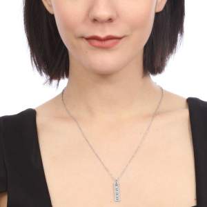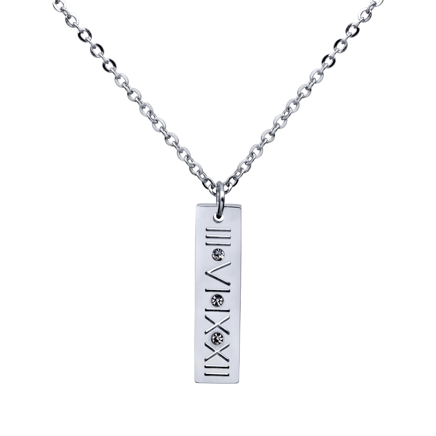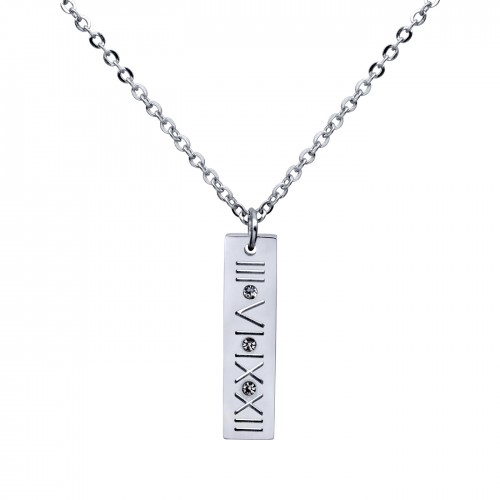 Dije con cadena en acero inoxidable en color blanco, con grabado de números romanos e incrustaciones de cristales blancos.