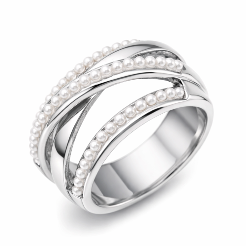 Anillo en baño de oro blanco, fino diseño entrelazado, con perlas en color blanco. Fabricado en una estructura de aleación de platino con rodio sin níquel.