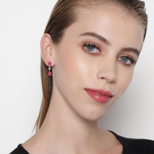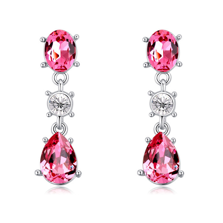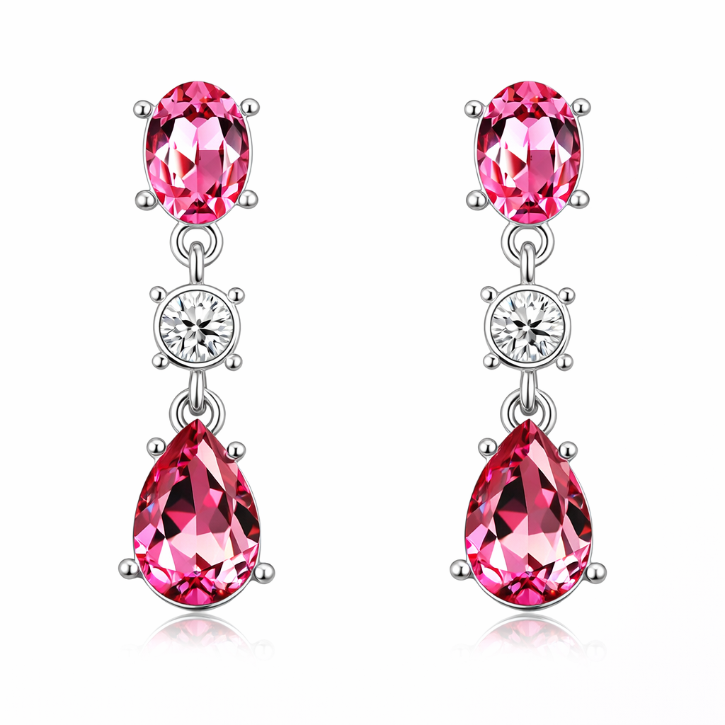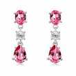 Hermosos aretes en baño de oro blanco de 18 quilates, diseño con incrustación de cristal rosa corte pera, cristal rosa corte oval y cristal blanco corte brillante. Fabricado en una estructura de aleación de platino con rodio sin níquel.