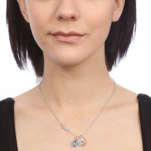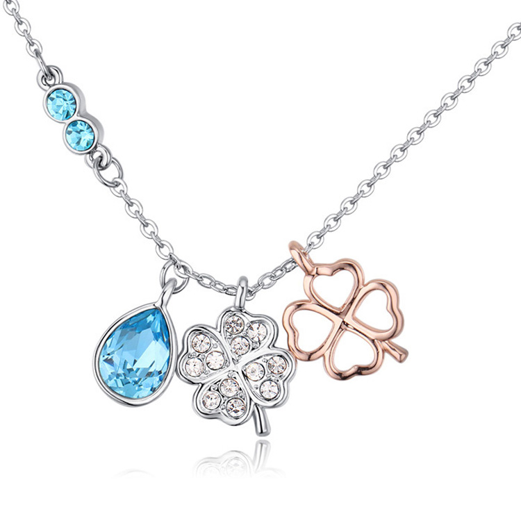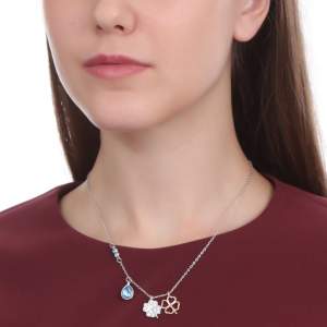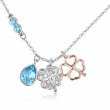 Collar en baño de oro blanco de 18 quilates con dijes de trébol y gota con incrustaciones de cristales en color azul y blanco. Fabricado en una estructura de aleación de platino con rodio sin níquel.