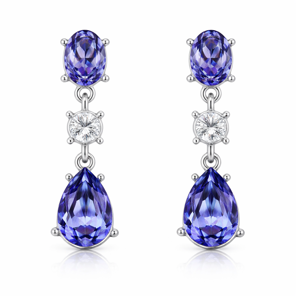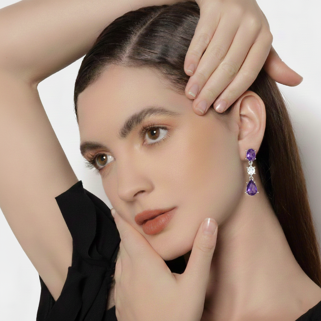 Hermosos aretes en baño de oro blanco de 18 quilates, diseño con incrustación de cristal morado corte pera, cristal morado corte oval y cristal blanco corte brillante. Fabricado en una estructura de aleación de platino con rodio sin níquel.