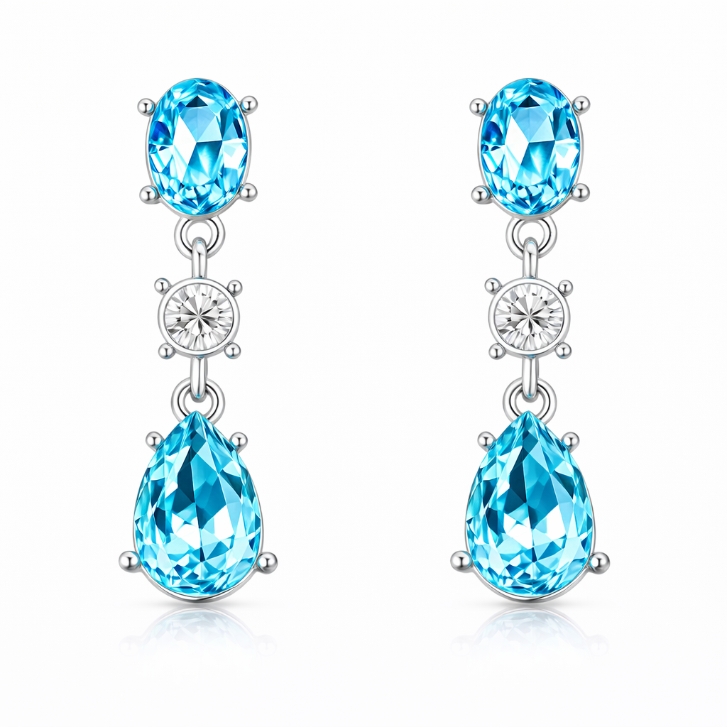 Hermosos aretes en baño de oro blanco de 18 quilates, diseño de gota con incrustaciónes de cristales azul y blanco. Fabricado en una estructura de aleación de platino con rodio sin níquel.