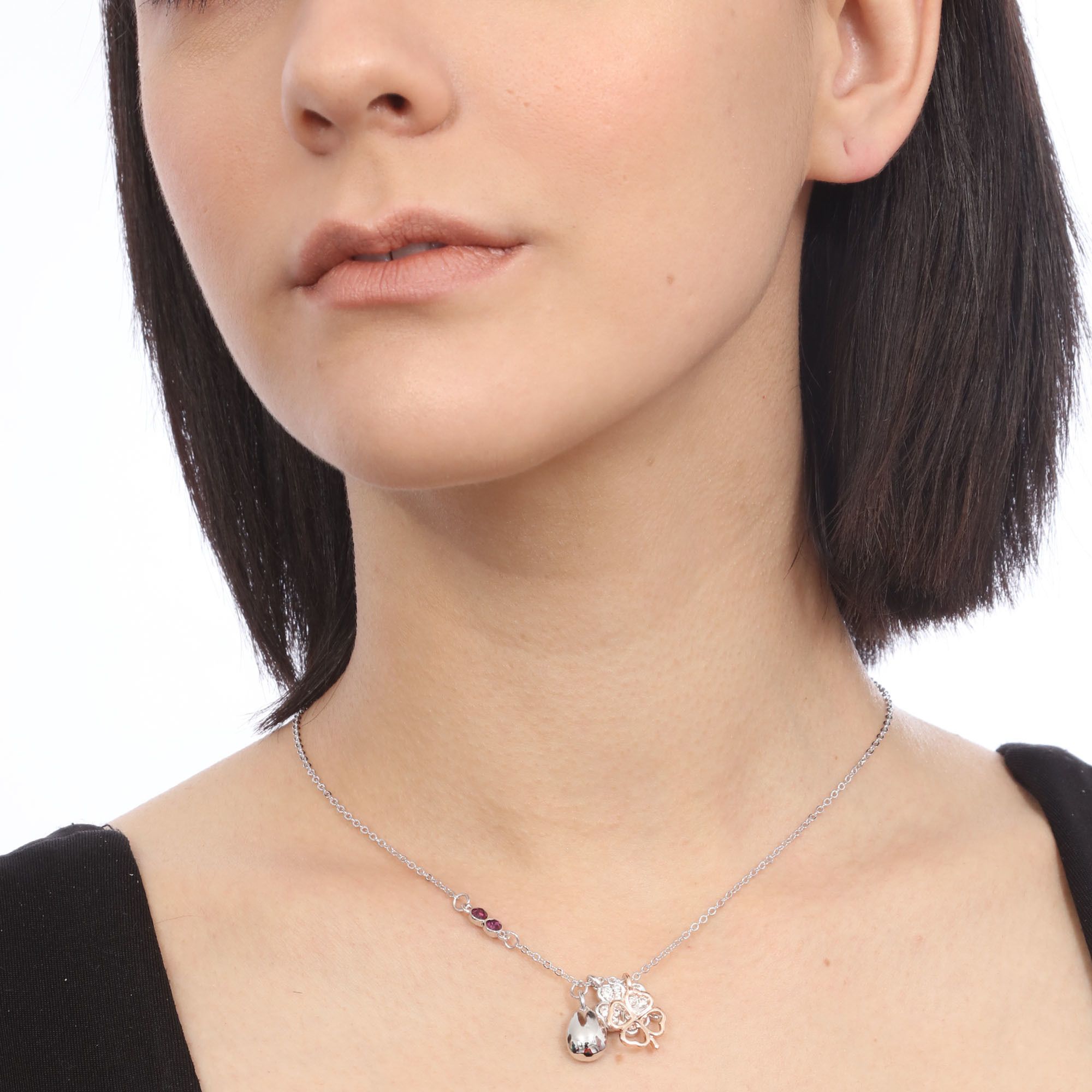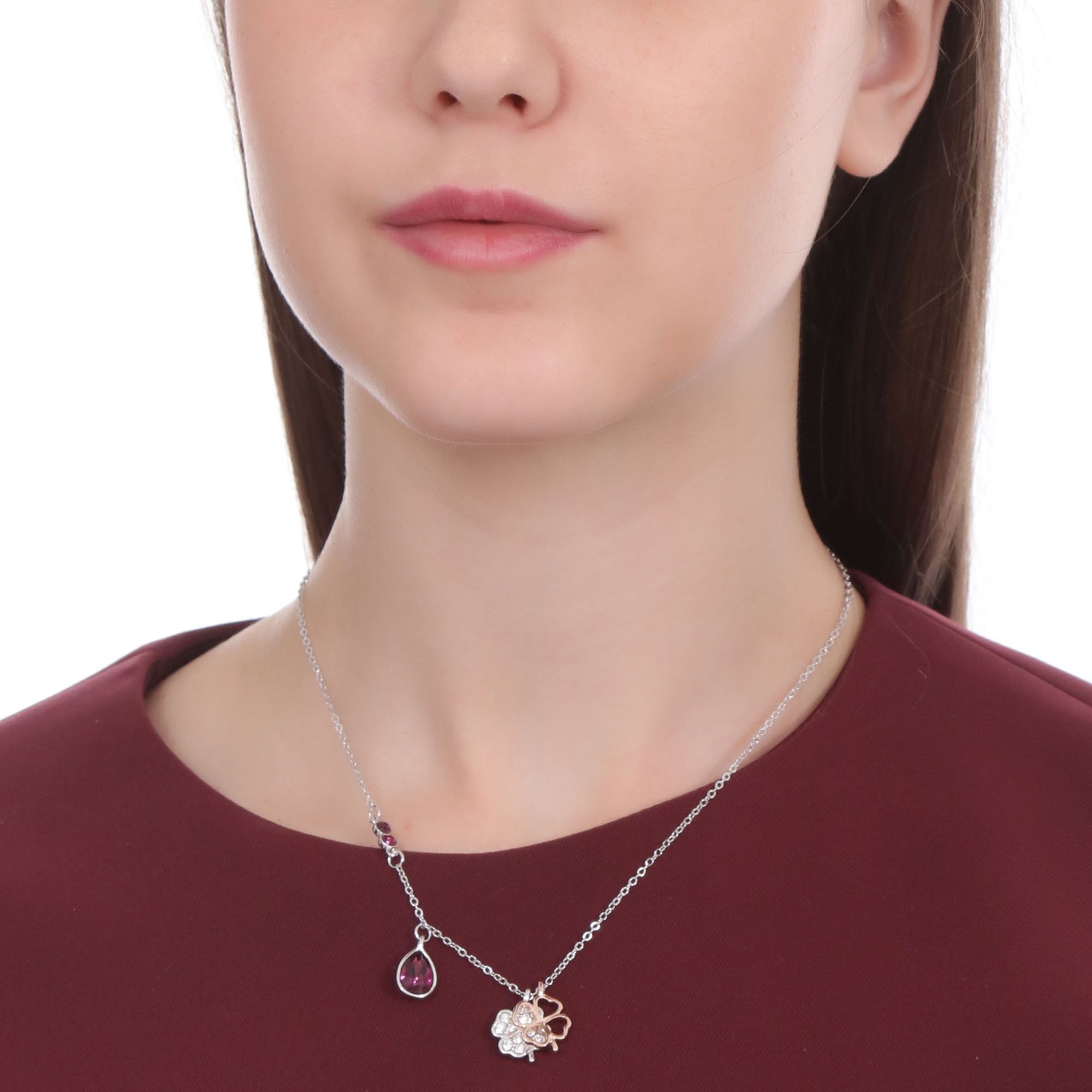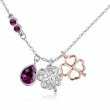 Collar en baño de oro blanco de 18 quilates , diseño de gota y trébol con incrustaciones de cristales en color blanco y purpura. Fabricado en una estructura de aleación de platino con rodio sin níquel.