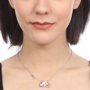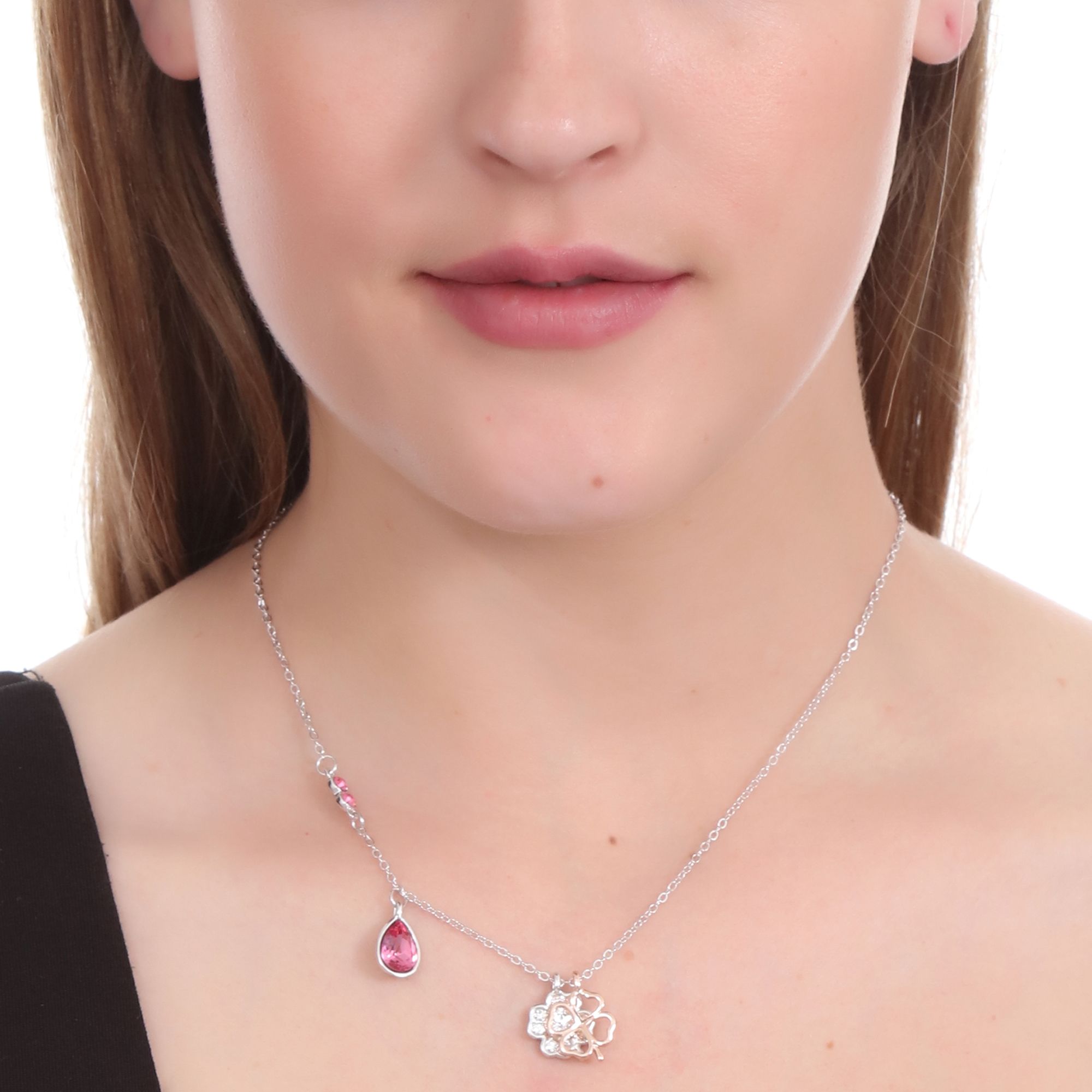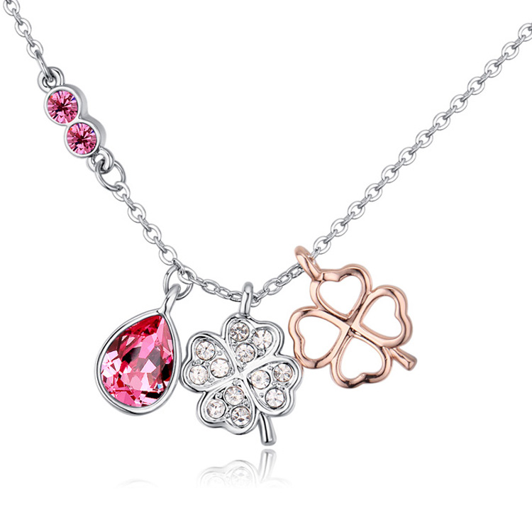 Collar en baño de oro blanco de 18 quilates , diseño de gota y trébol con incrustaciones de cristales en color blanco y rosa. Fabricado en una estructura de aleación de platino con rodio sin níquel.