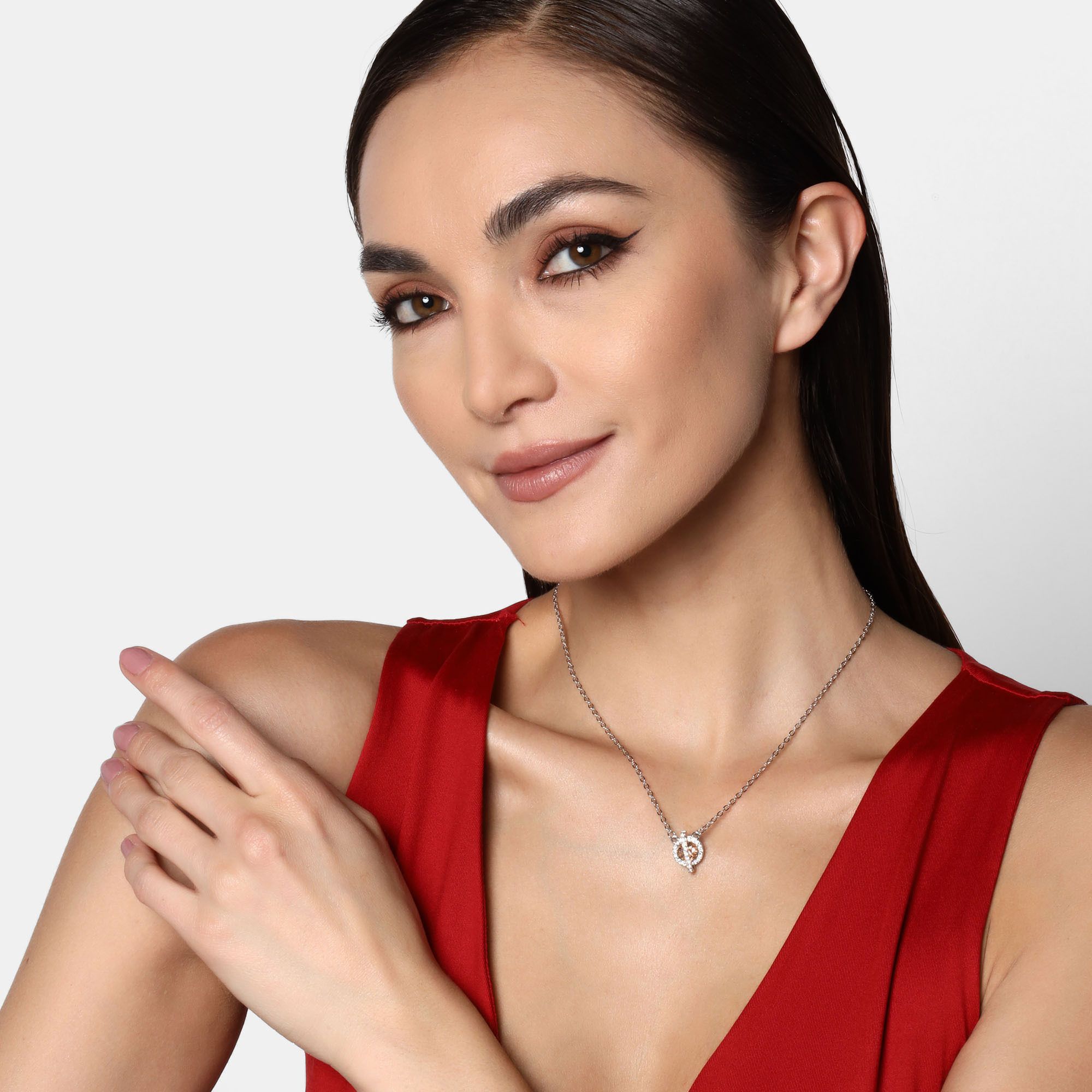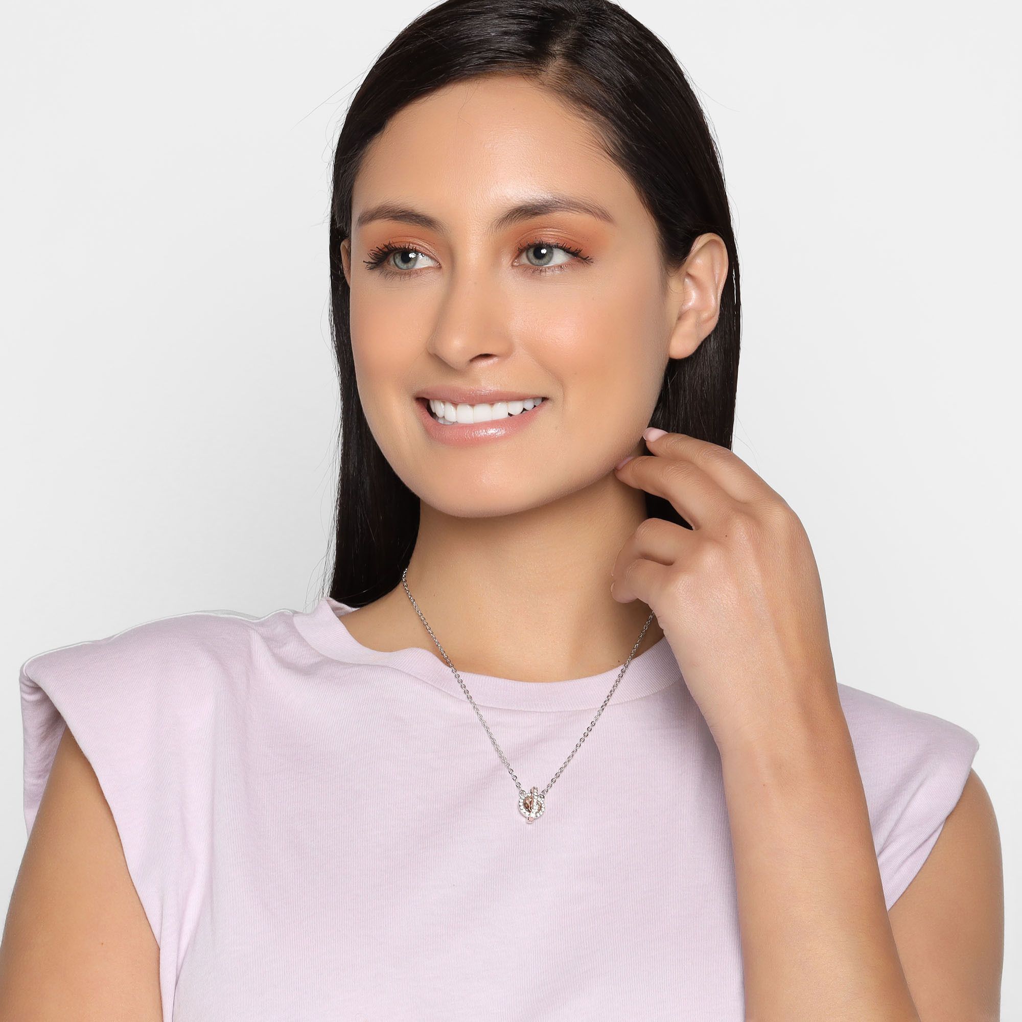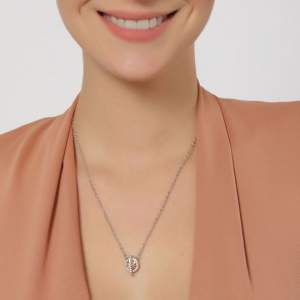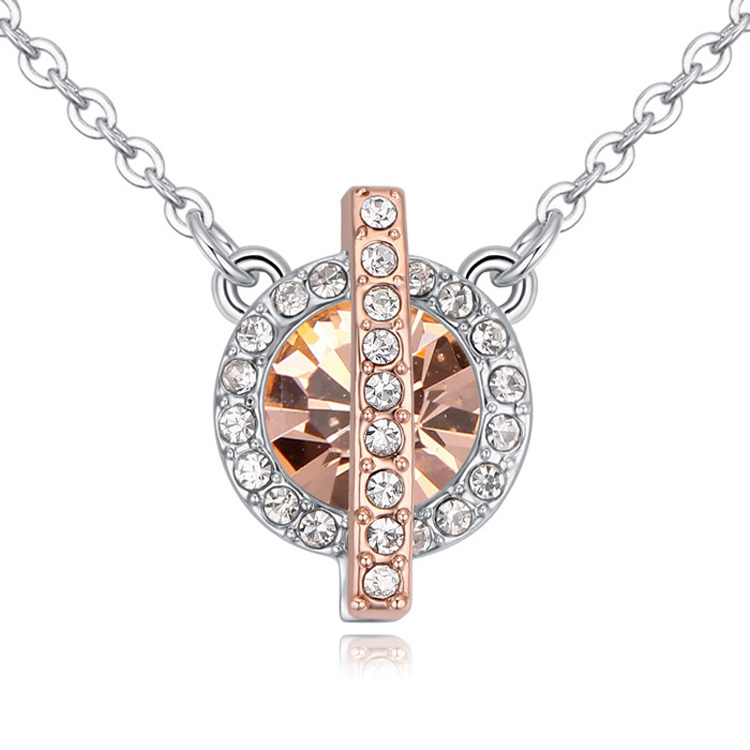 Collar en baño de oro blanco de 18 quilates , diseño de circulo con incrustaciones de cristales en color ámbar y blanco. Fabricado en una estructura de aleación de platino con rodio sin níquel.