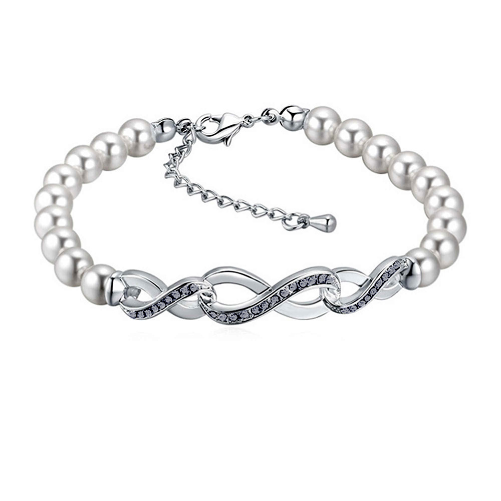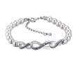 Pulsera en baño de oro blanco de 18 quilates , diseño de infinito con incrustaciones de cristales en color oxford y perlas blancas. Fabricado en una estructura de aleación de platino con rodio sin níquel.