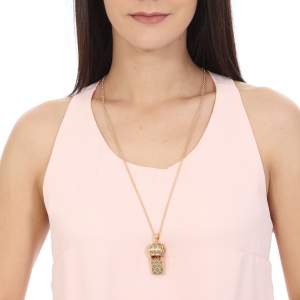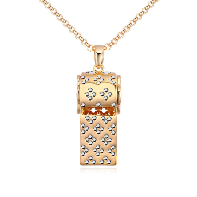 Collar para sweater en baño de oro amarillo de 18 quilate , diseño de silbato con incrustaciones de cristales en color oxford. Fabricado en una estructura de aleación de platino con rodio sin níquel.