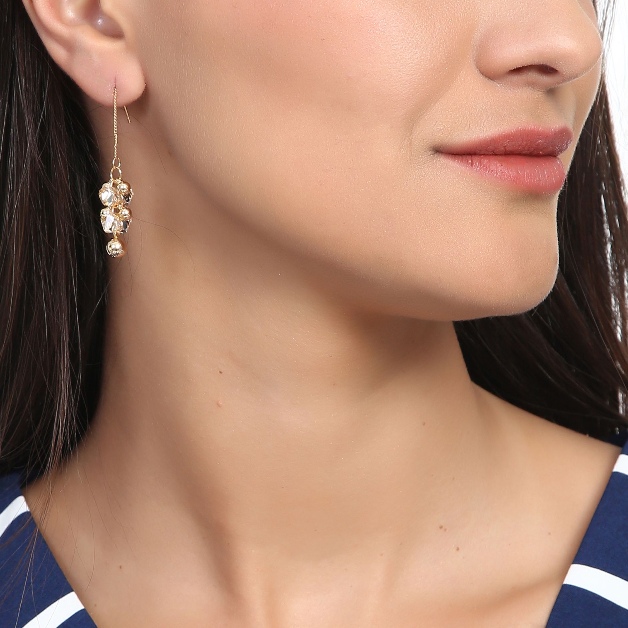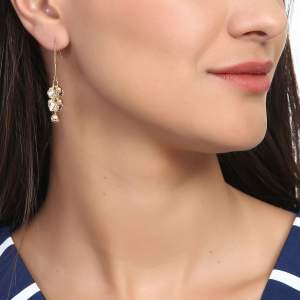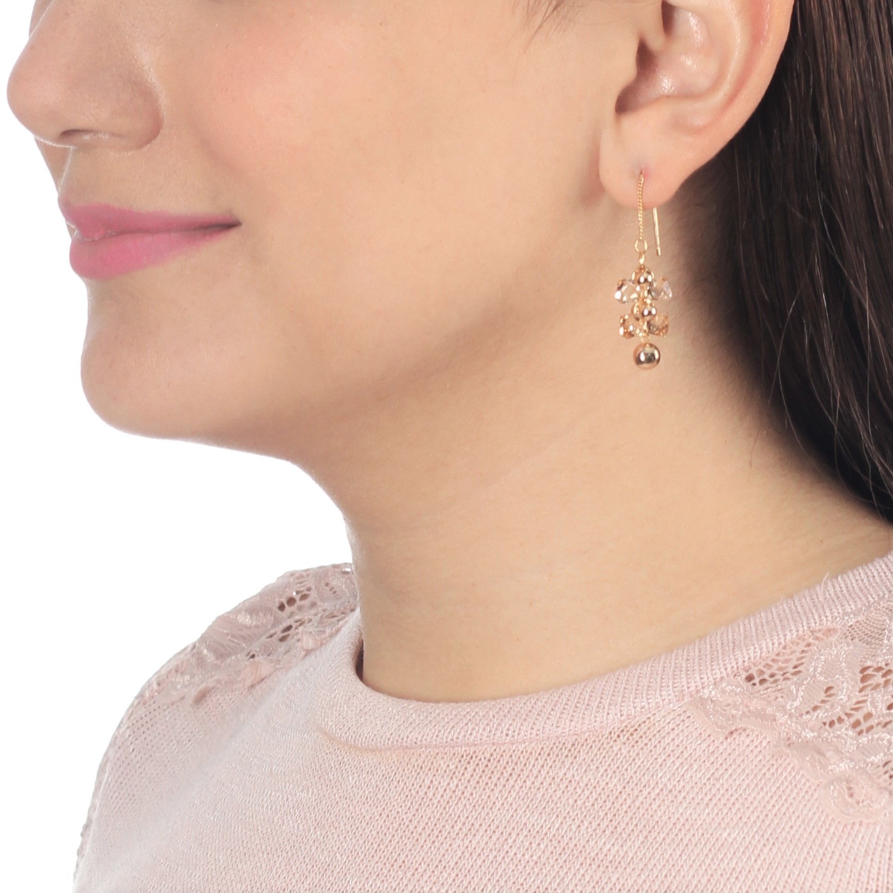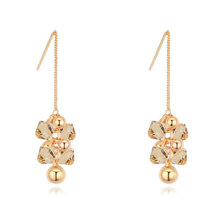 Finos pendientes en baño de oro amarillo de 18 quilates con cristales en color ámbar y esferas doradas. Fabricado en una estructura de aleación de platino con rodio sin níquel.