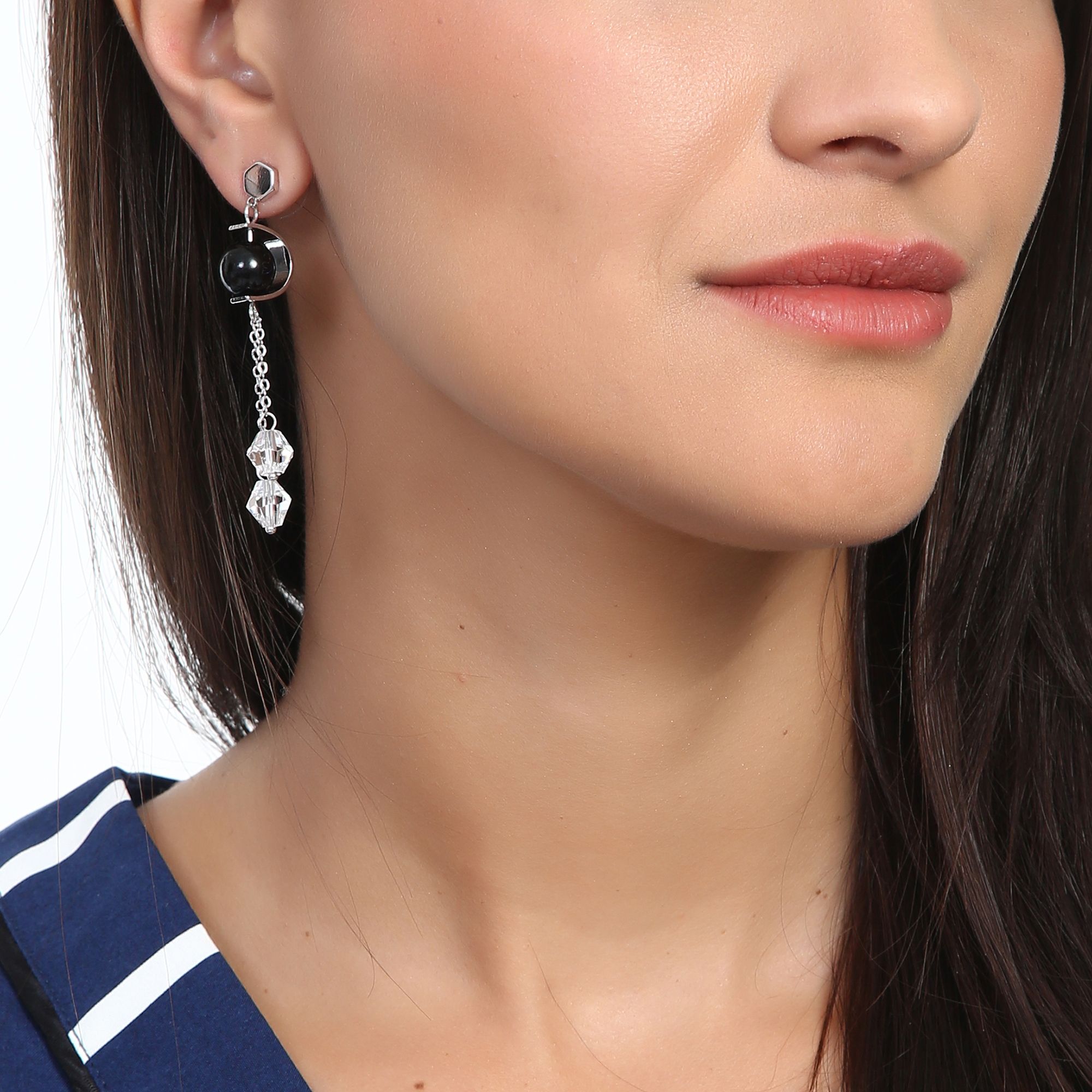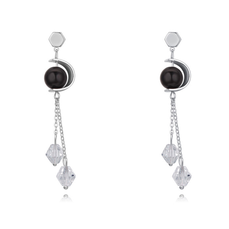 Finos aretes en baño de oro blanco de 18 quilates con cristales en color blanco y perla negra de cristal. Fabricado en una estructura de aleación de platino con rodio sin níquel.