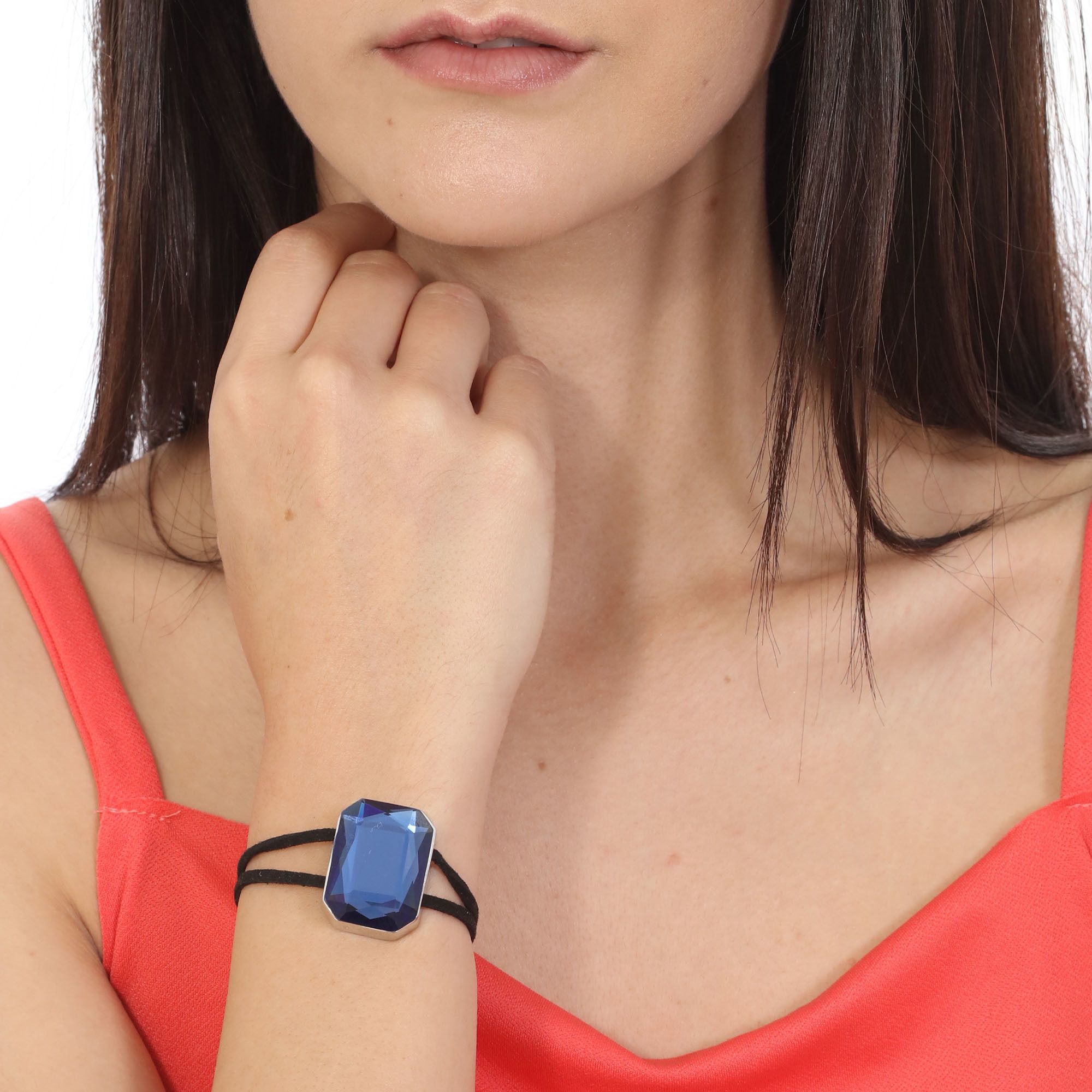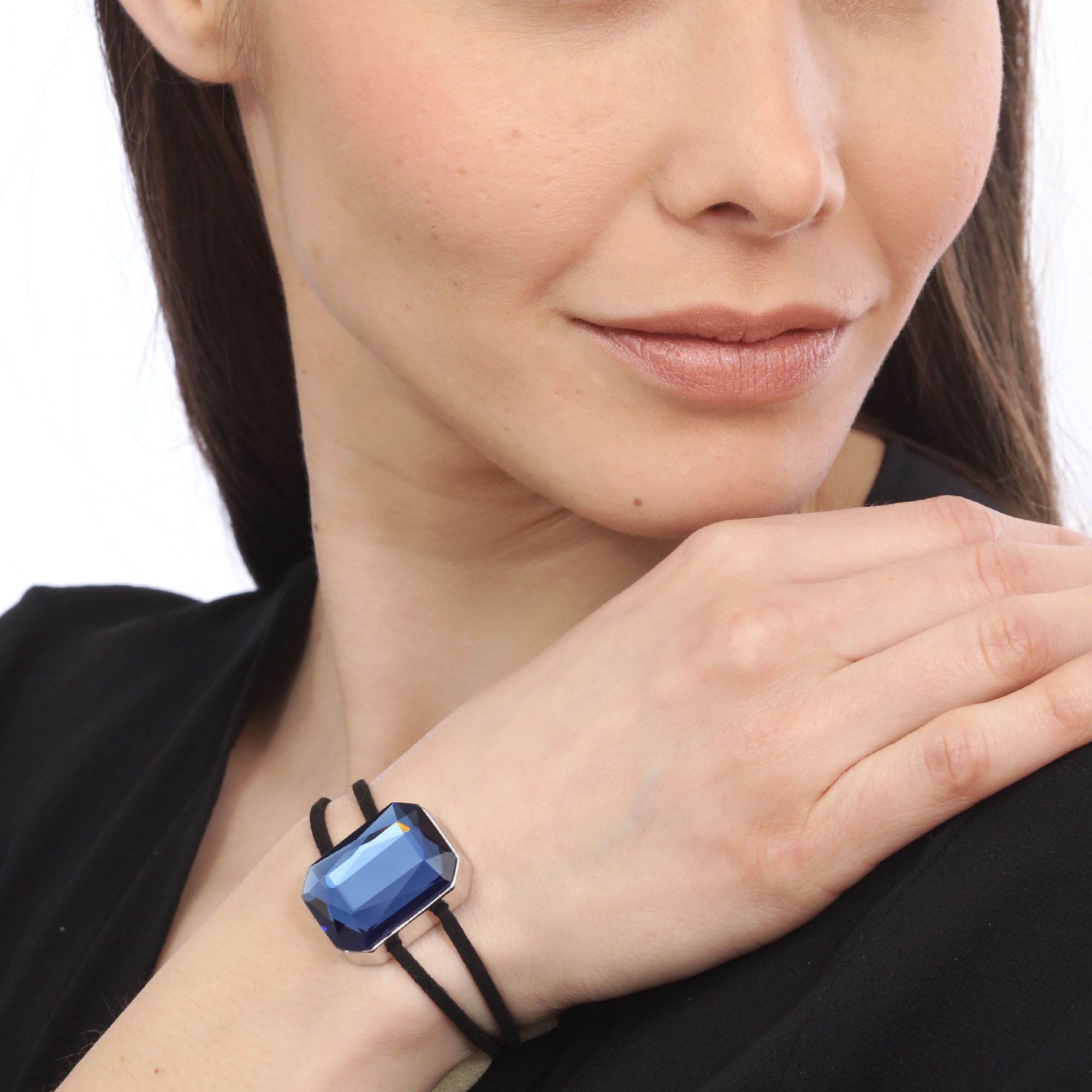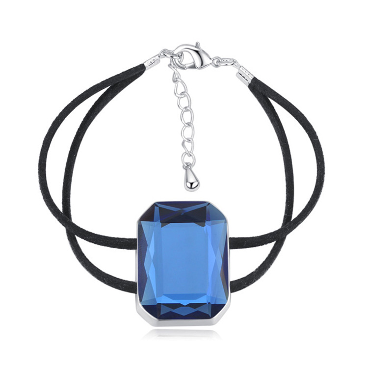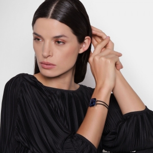 Pulsera con detalles en baño de oro blanco de 18 quilates, cristal en azul marino corte esmeralda y correa color negro. Fabricado en una estructura de aleación de platino con rodio sin níquel.