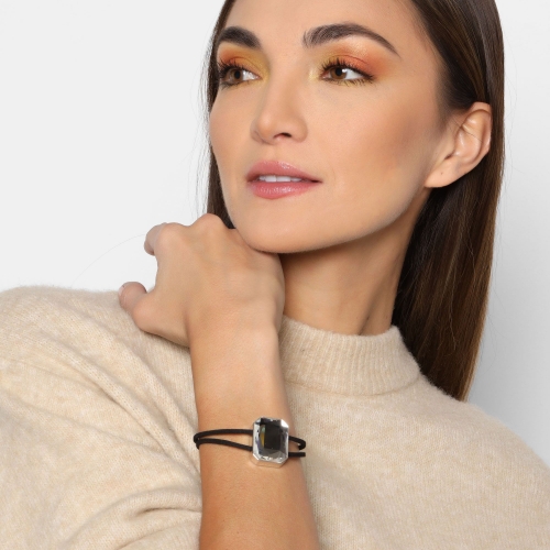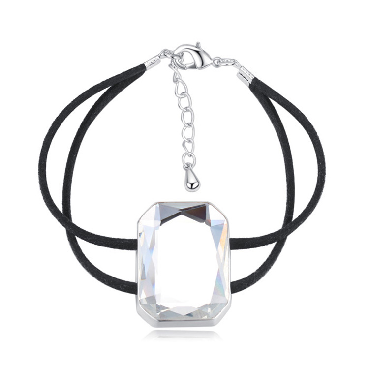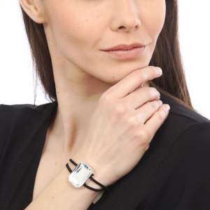 Pulsera con detalles en baño de oro blanco de 18 quilates con cristal en color blanco corte esmeralda y correa negra. Fabricado en una estructura de aleación de platino con rodio sin níquel.