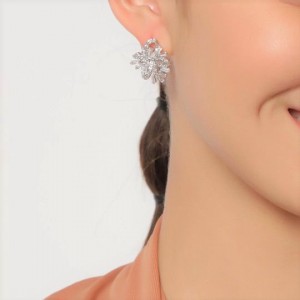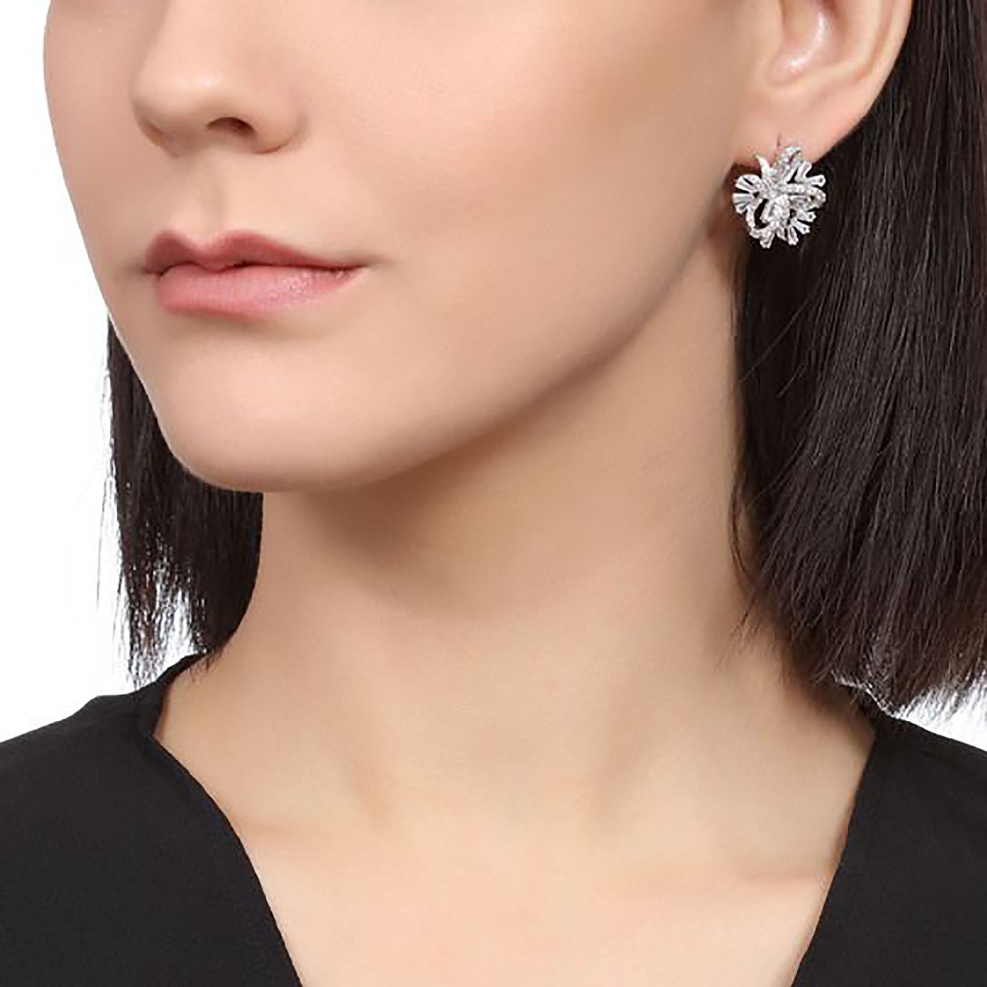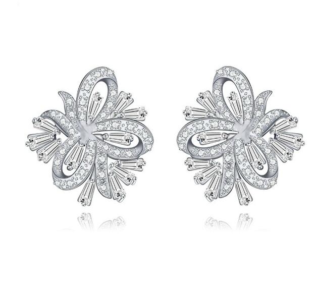 Finos aretes en baño de oro blanco de 18 quilates, diseño entrelazado con incrustaciones de cristales en color blanco. Fabricado en una estructura de aleación de platino con rodio sin níquel.