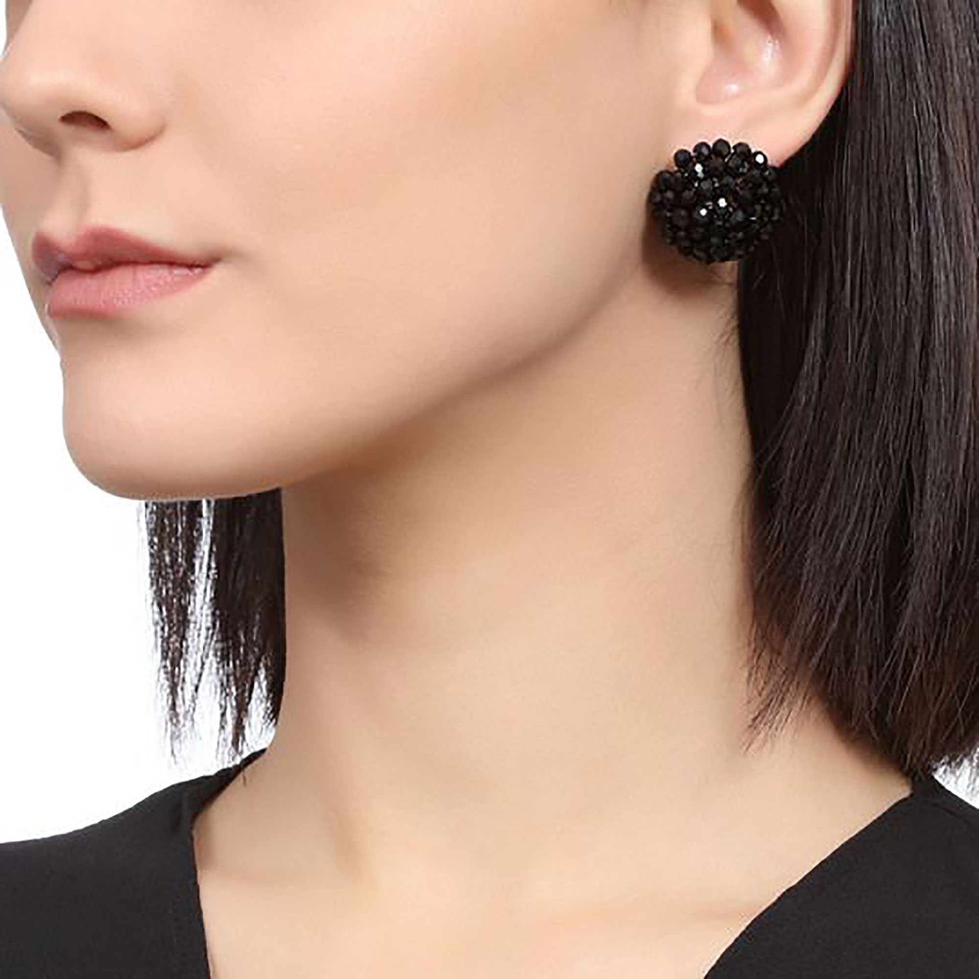 Aretes en baño de oro blanco de 18 quilates con incrustaciones de cristales en color negro. Fabricado en una estructura de aleación de platino con rodio sin níquel.