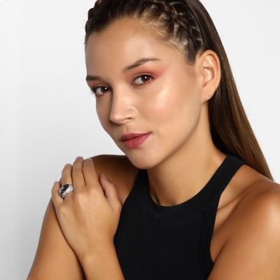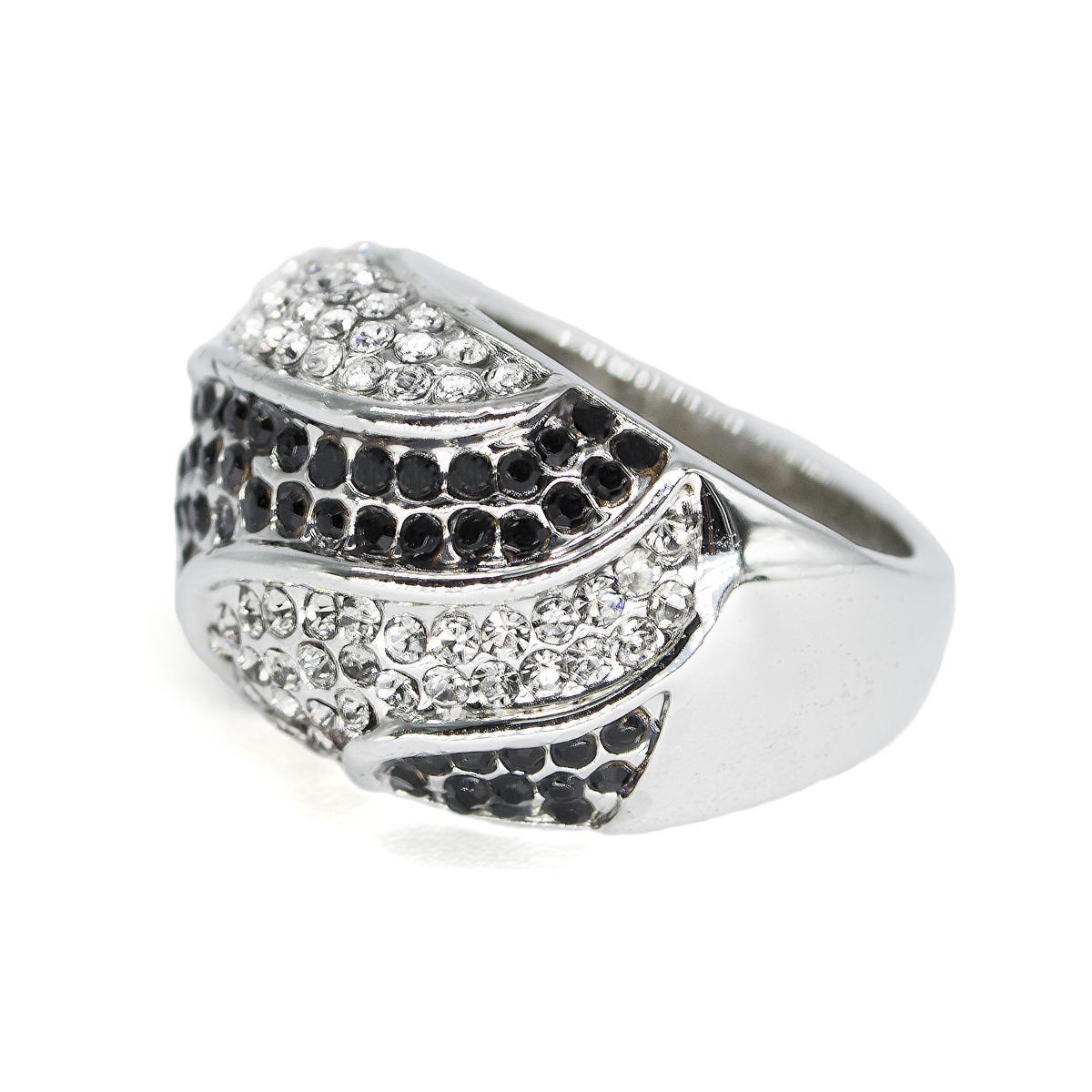 Delicado anillo en baño de oro blanco de 18 quilates, original diseño de ondas, con incrustaciones de cristales en color blanco y negro. Fabricado en una estructura de aleación de platino con rodio sin níquel.