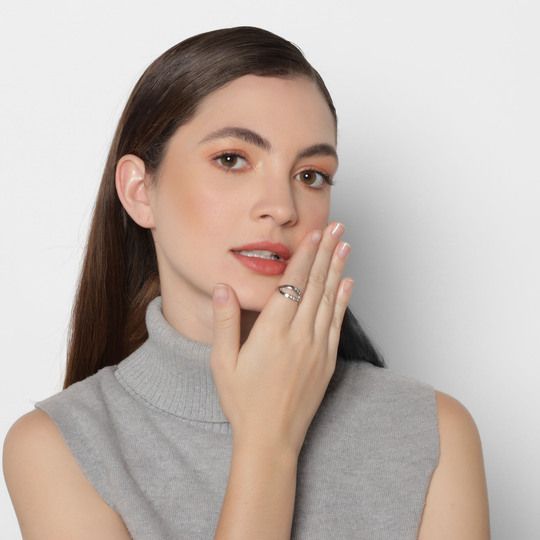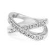 Hermoso anillo, en baño de oro blanco de 18 quilates, diseño en forma de "X", con incrustaciones de cristales en color blanco. Fabricado en una estructura de aleación de platino con rodio sin níquel.