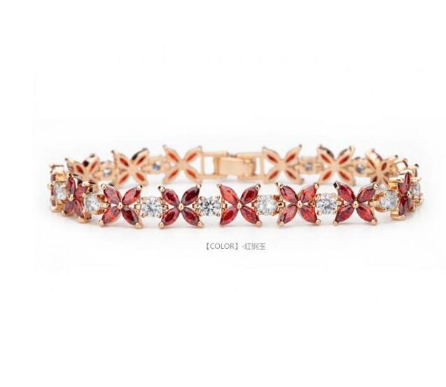 Linda pulsera en baño de oro amarillo de 18 quilates , diseño de flores con incrustaciones de cristales corte marquesa en color blanco y rojo. Fabricado en una estructura de aleación de platino con rodio sin níquel.