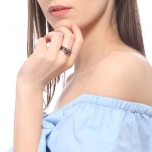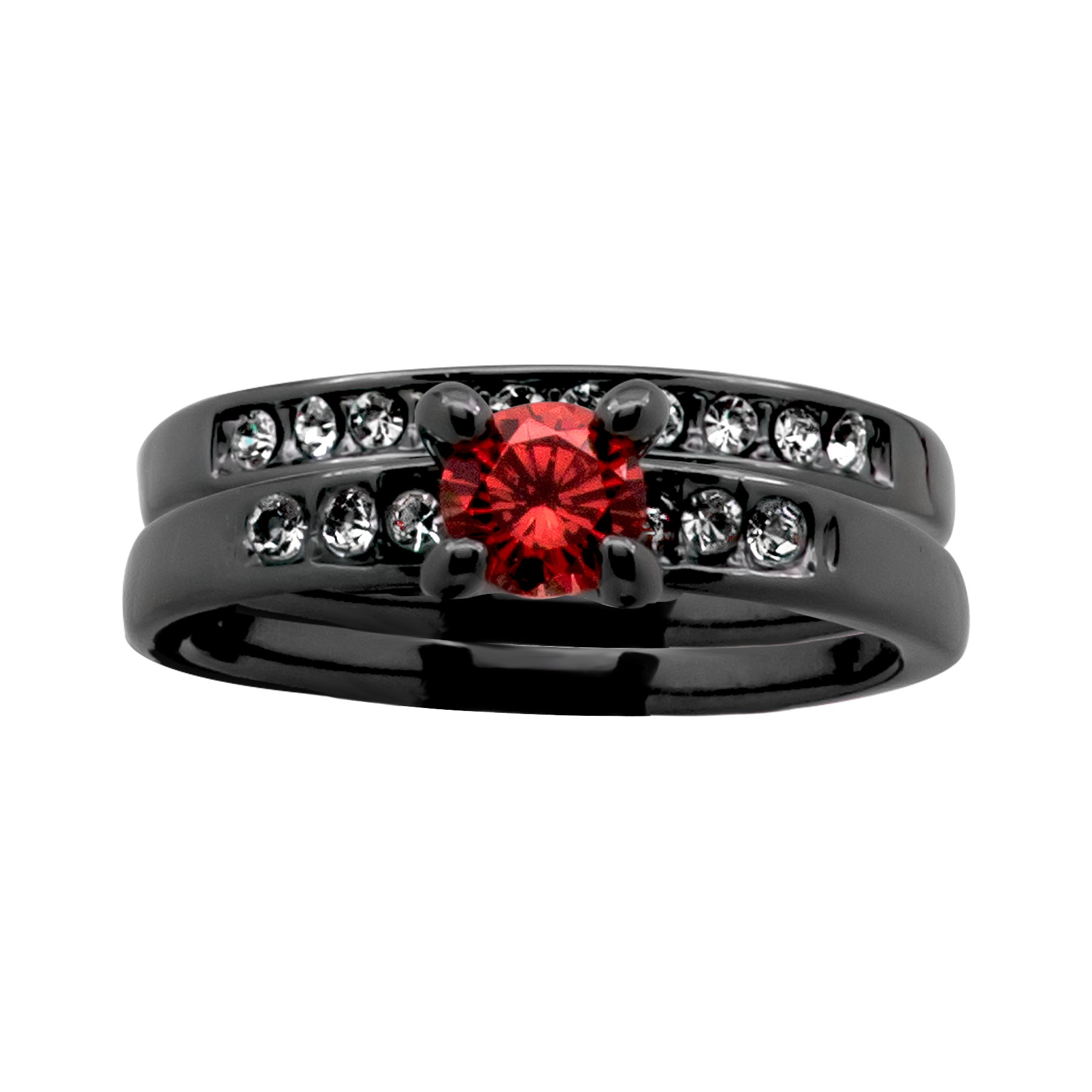 Anillo doble, de cerámica negra, fino diseño con cristal rojo corte brillante e incrustaciones de cristales blancos.