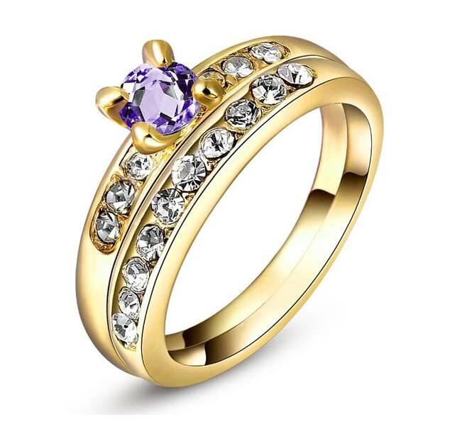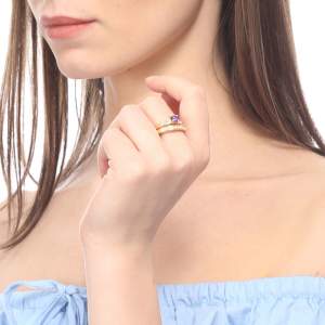 Anillo doble, en baño de oro amarillo de 18 quilates, fino diseño con cristal moarado corte brillante e incrustaciones de cristales blancos. Fabricado en una estructura de aleación de platino con rodio sin níquel.