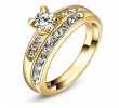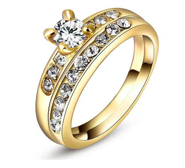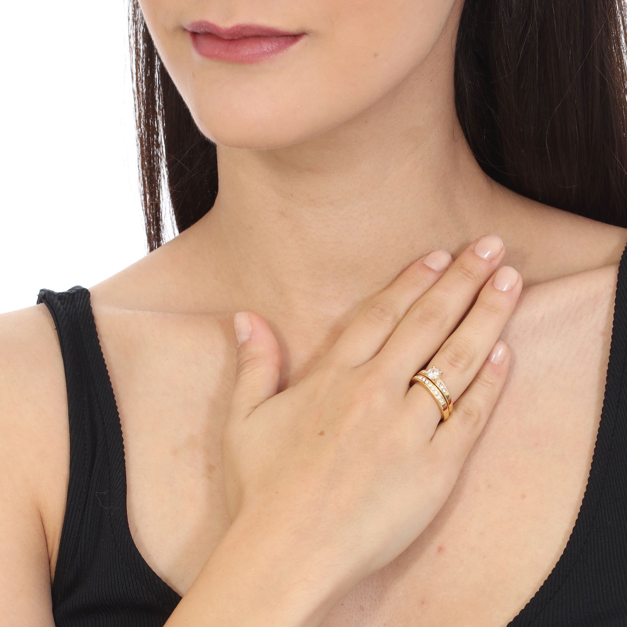Anillo doble, en baño de oro amarillo de 18 quilates, fino diseño con cristal blanco corte brillante e incrustaciones de cristales blancos. Fabricado en una estructura de aleación de platino con rodio sin níquel.