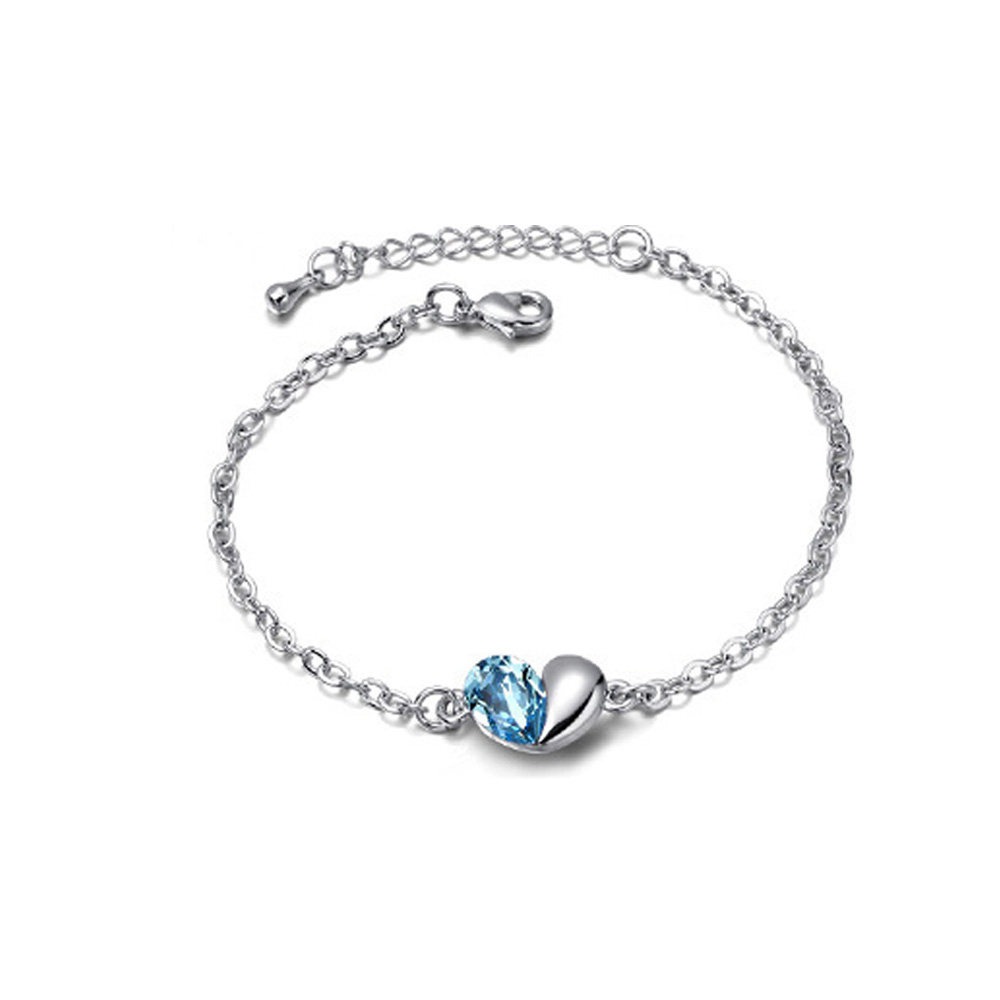 Linda pulsera en baño de oro blanco de 18 quilates , diseño de corazón con incrustaciones de cristales en color azul. Fabricado en una estructura de aleación de platino con rodio sin níquel.