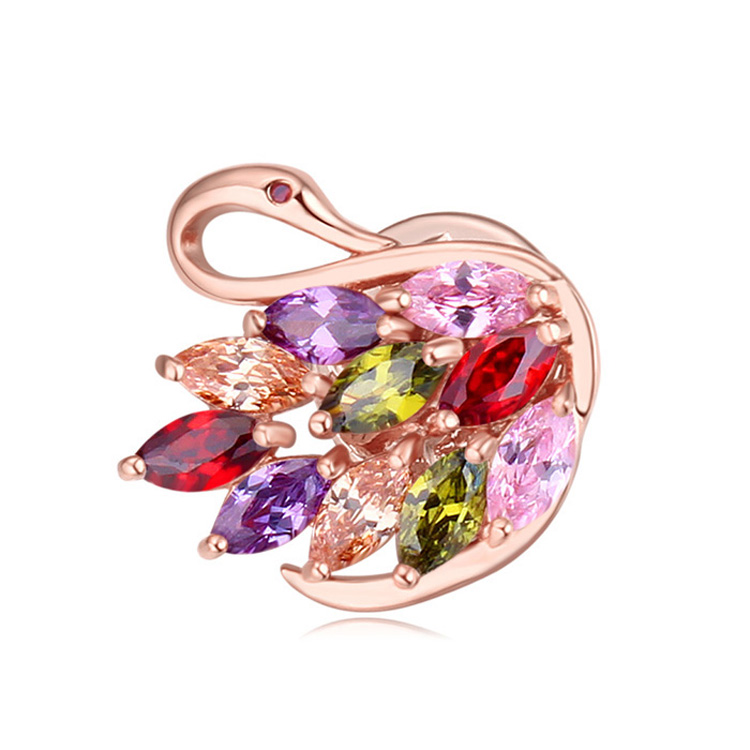 Prendedor en baño de oro rosa de 18 quilates, diseño de cisne, con cristales en colores verde, rosa, lila, rojo y blanco corte marquesa y pequeño cristal ámbar. Fabricado en una estructura de aleación de platino con rodio sin níquel.