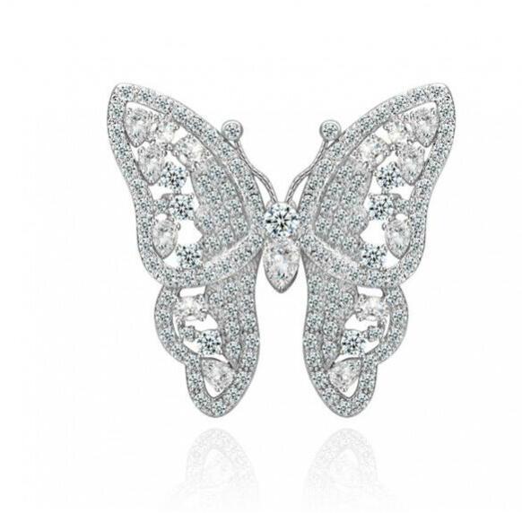 Prendedor en baño de oro blanco de 18 quilates, diseño de mariposa con incrustaciones de cristales en color blanco. Fabricado en una estructura de aleación de platino con rodio sin níquel.