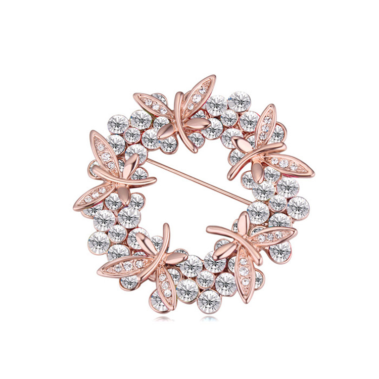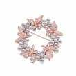 Prendedor en baño de oro rosa de 18 quilates, diseño de corona, con libélulas rosadas, cristales en color blanco y chispas de cristales blancos. Fabricado en una estructura de aleación de platino con rodio sin níquel.