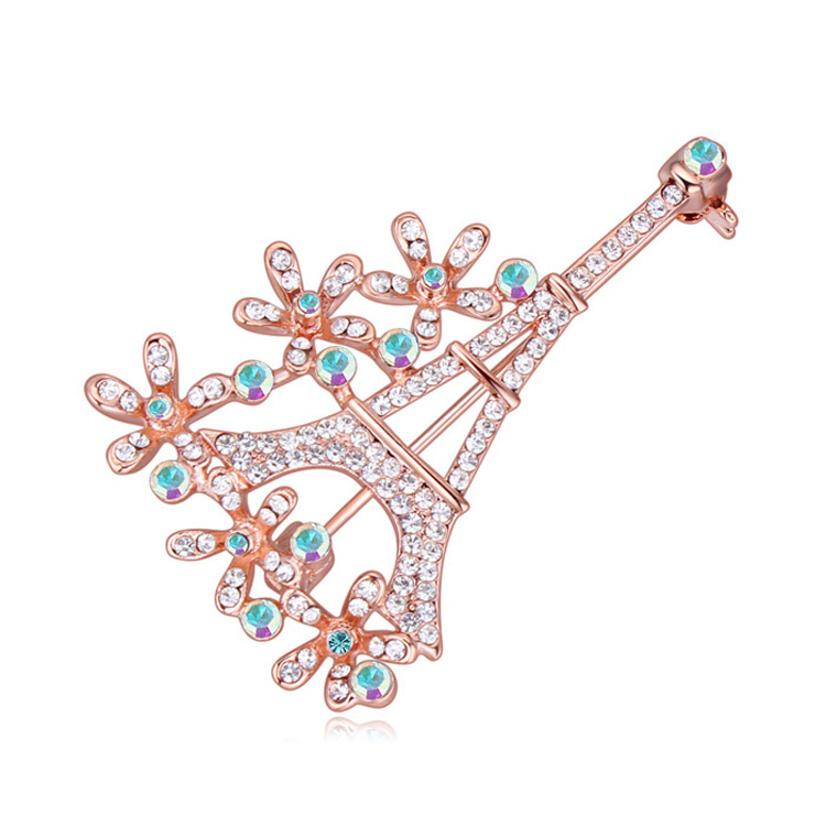 Prendedor en baño de oro rosa de 18 quilates, diseño de torre Eiffel, flores, con cristales en color tornasol y blanco. Fabricado en una estructura de aleación de platino con rodio sin níquel.