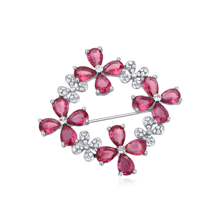 Prendedor en baño de oro blanco de 18 quilates, diseño de corona de flores, con cristales fucsia corte pera e incrustaciones de cristales blancos. Fabricado en una estructura de aleación de platino con rodio sin níquel.