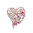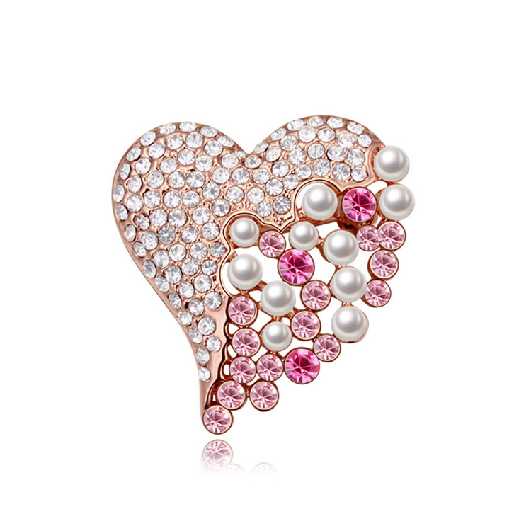 Prendedor en baño de oro amarillo de 18 quilates, diseño de corazón, con incrustaciones de cristales en color blanco, rosa y fucsia y perlas blancas. Fabricado en una estructura de aleación de platino con rodio sin níquel.