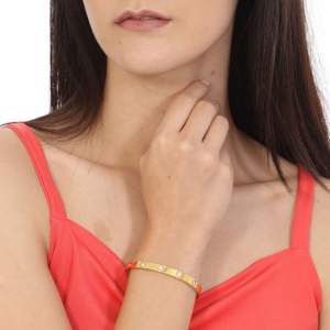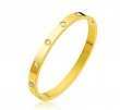 Brazalete de acero inoxidable en color amarillo con cristales color blanco.