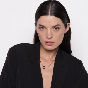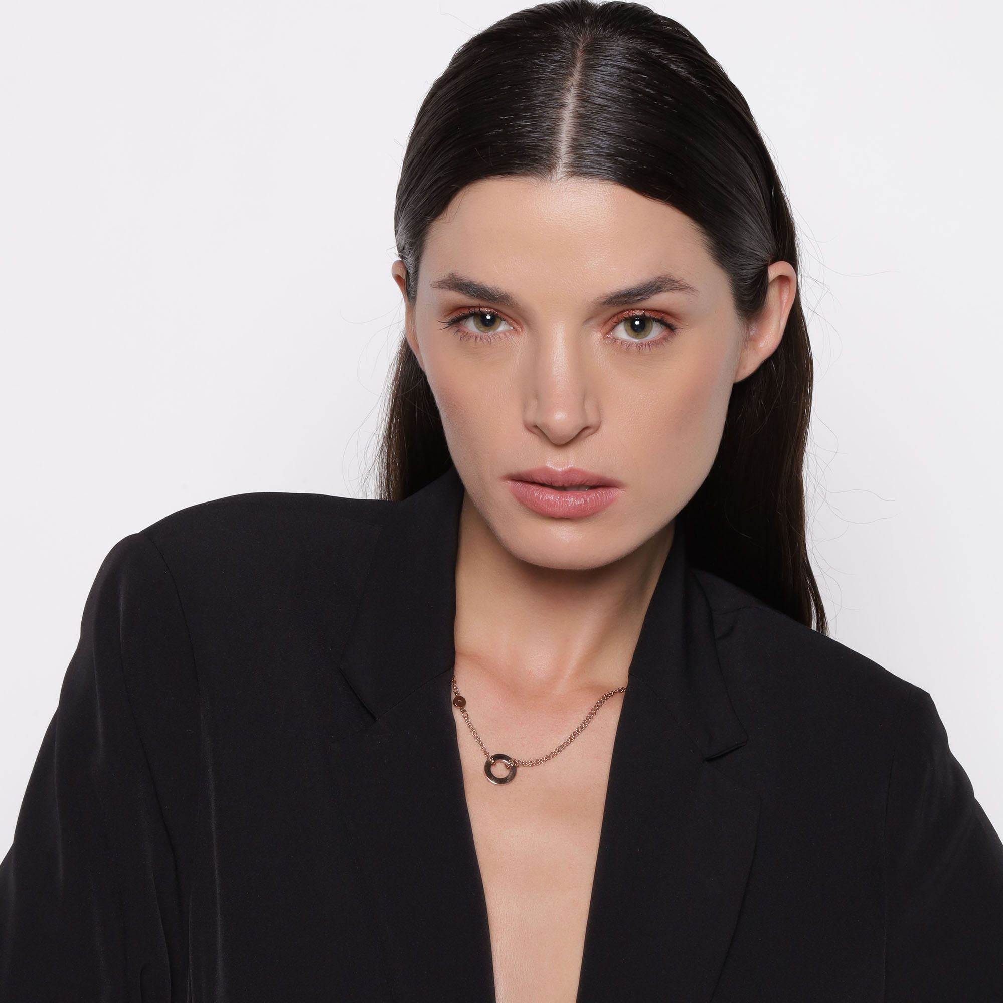 Collar de acero inoxidable en color rosa, con grabado de leyenda "LOVE, LOVE" e incrustaciones de cristales en color blanco.