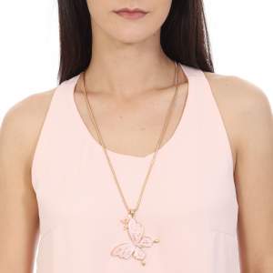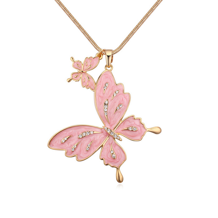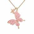 Collar para sweater en baño de oro amarillo de 18 quilates, diseño de mariposa con esmaltado rosa e incrustaciones de cristales en color blanco. Fabricado en una estructura de aleación de platino con rodio sin níquel.