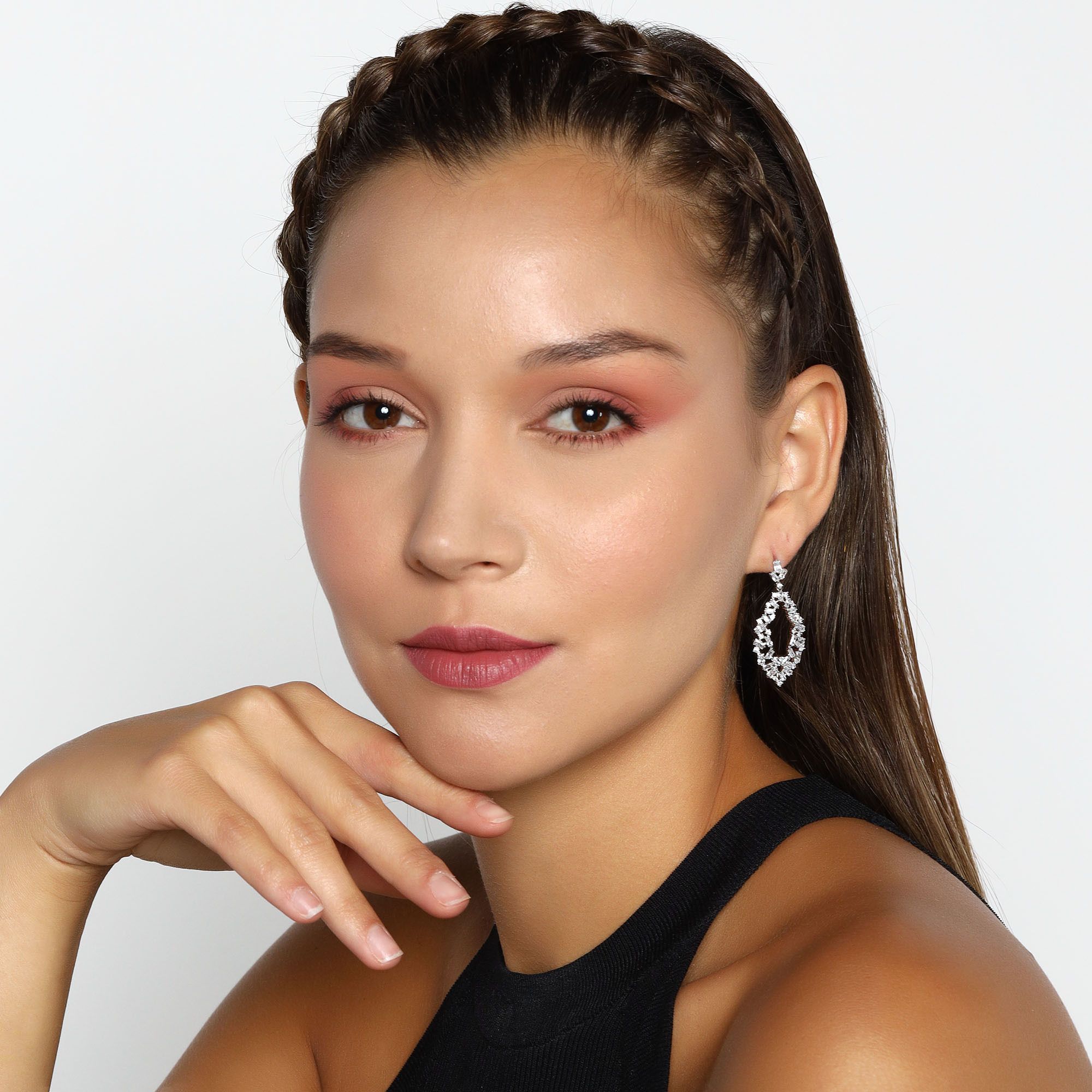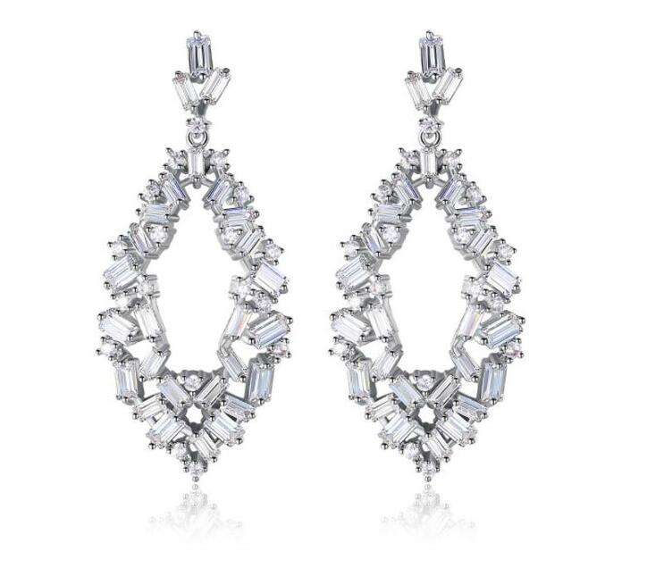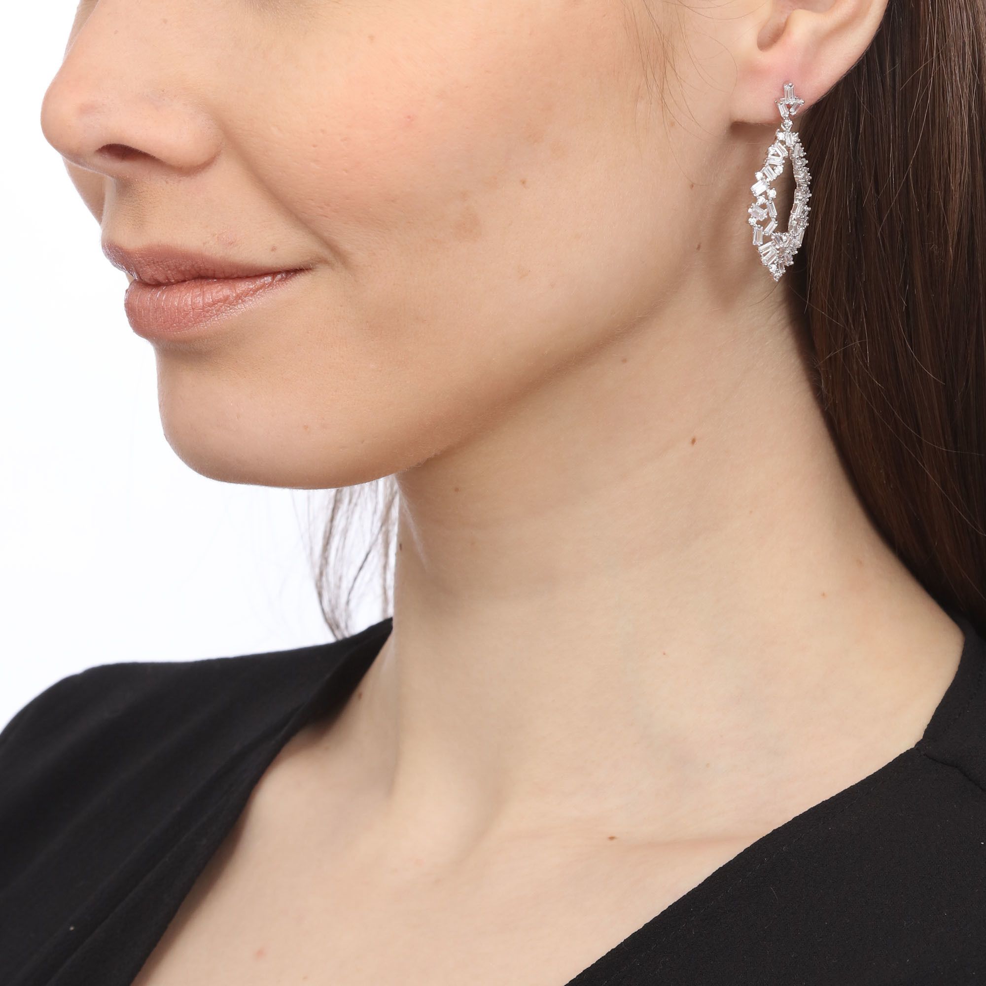 Hermosos aretes en baño de oro blanco de 18 quilates, diseño de gota con incrustaciones de cristales blancos corte baguette y corte brillante.