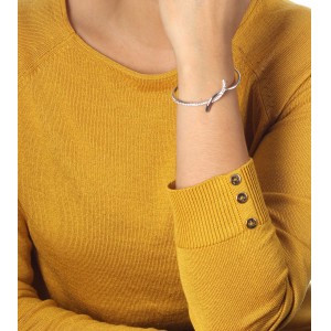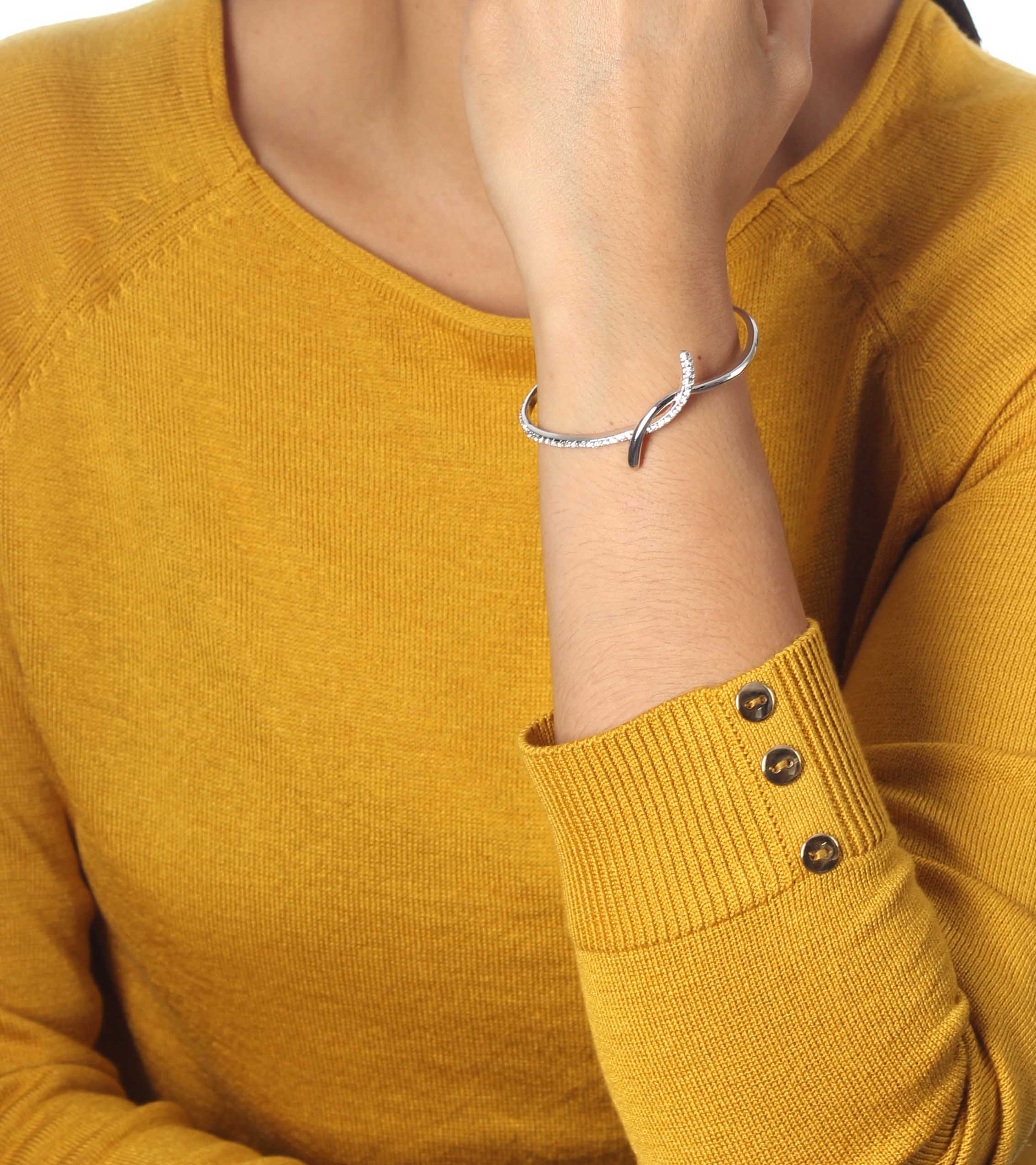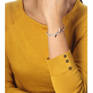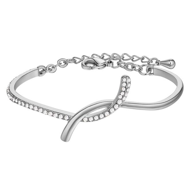 Delicado brazalete en baño de oro blanco de 18 quilates, lindo diseño con incrustraciones de cristales en color blanco. Fabricado en una estructura de aleación de platino con rodio sin níquel.
