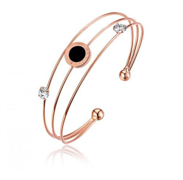 Pulsera en baño de oro rosa de 18 quilates, original diseño ajustable con incrustración de cristales en color blanco y detalle en esmaltado negro. Fabricado en una estructura de aleación de platino con rodio sin níquel