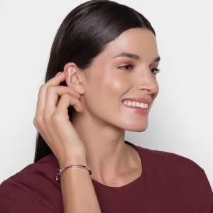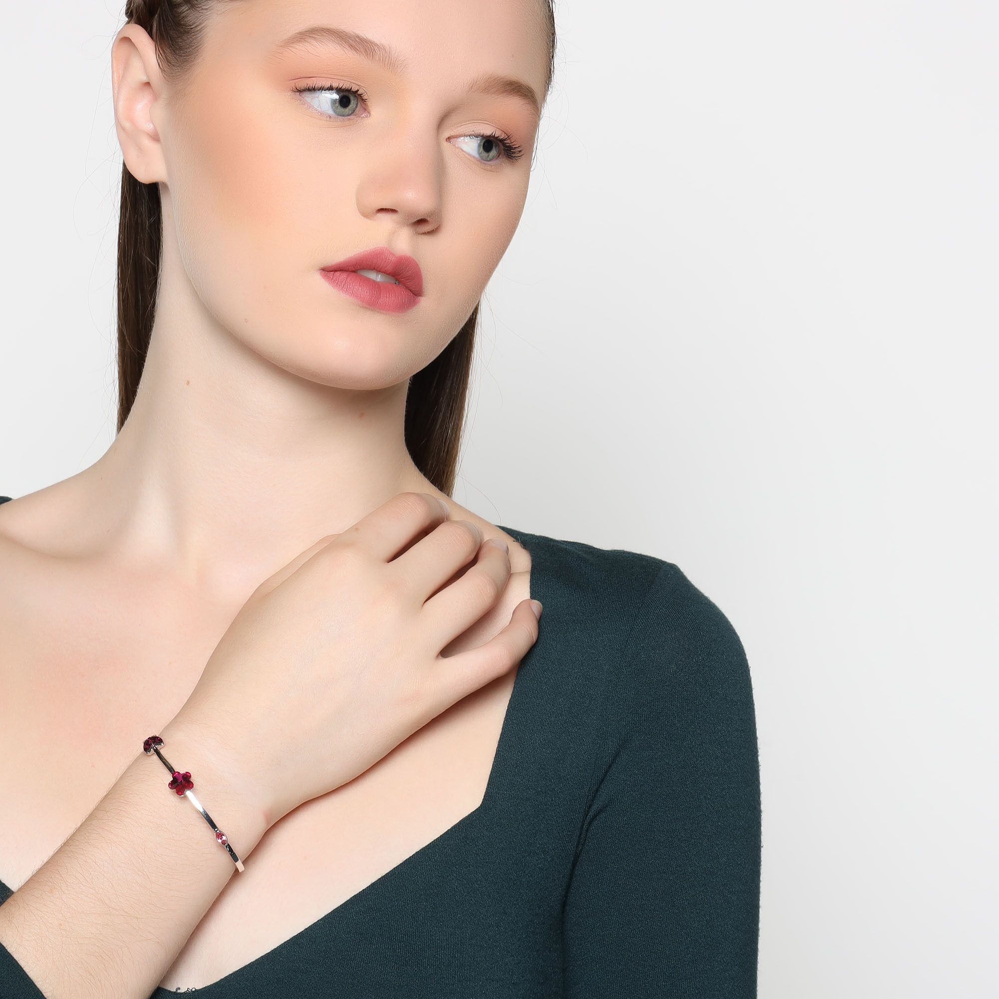Delicado brazalete en baño de oro blanco de 18 quilates, diseño con pequeñas figuras de mariposa morada, flor y ovalo fucsia de cristal. Fabricado en una estructura de aleación de platino con rodio sin níquel.
