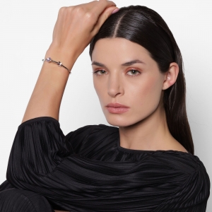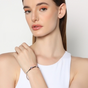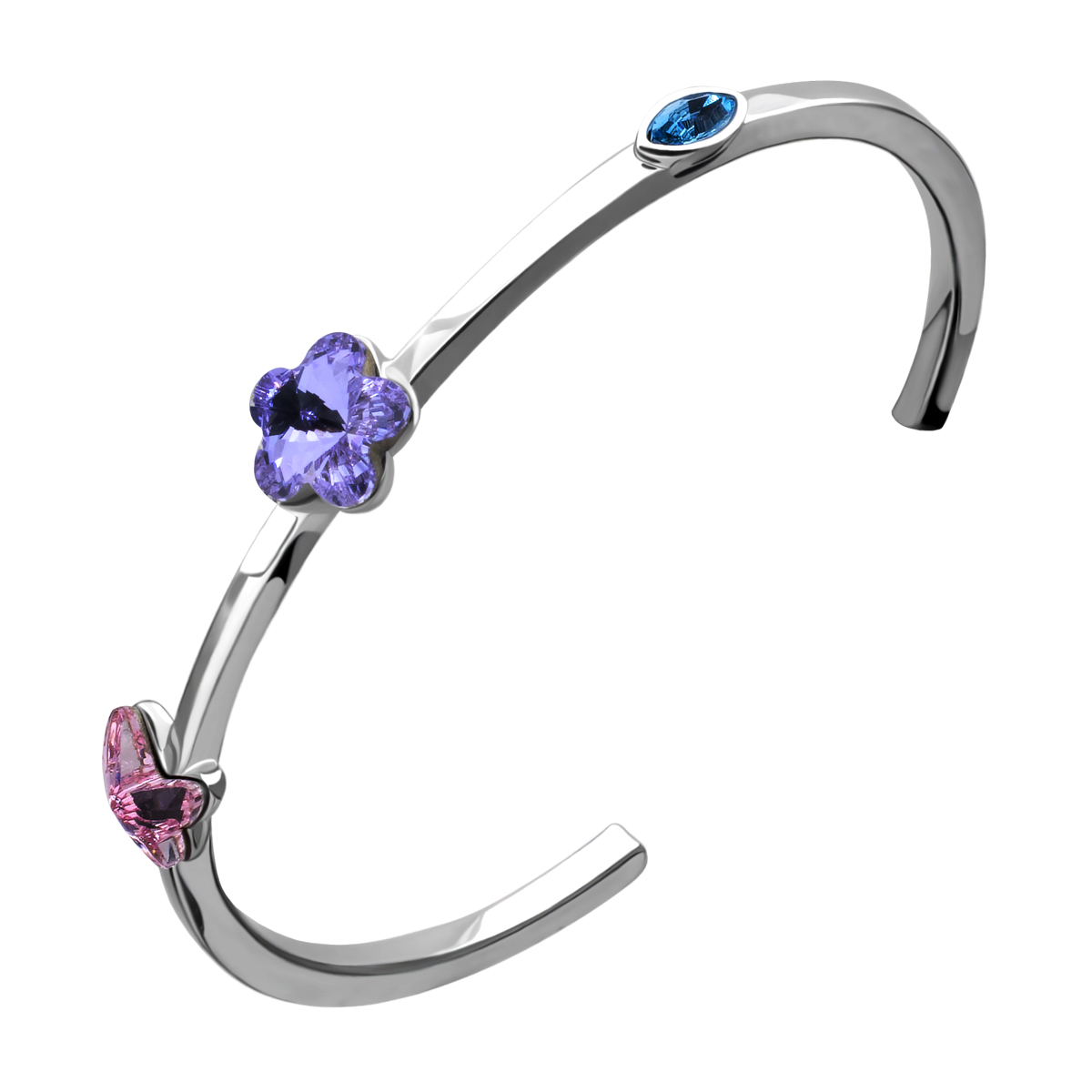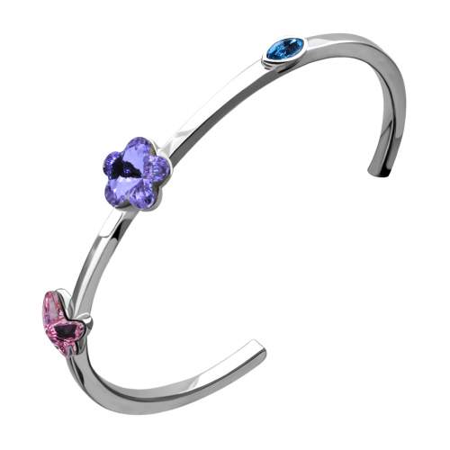 Delicado brazalete en baño de oro blanco de 18 quilates, diseño con pequeñas figuras de mariposa rosa, flor morada y ovalo azul de cristal. Fabricado en una estructura de aleación de platino con rodio sin níquel.