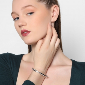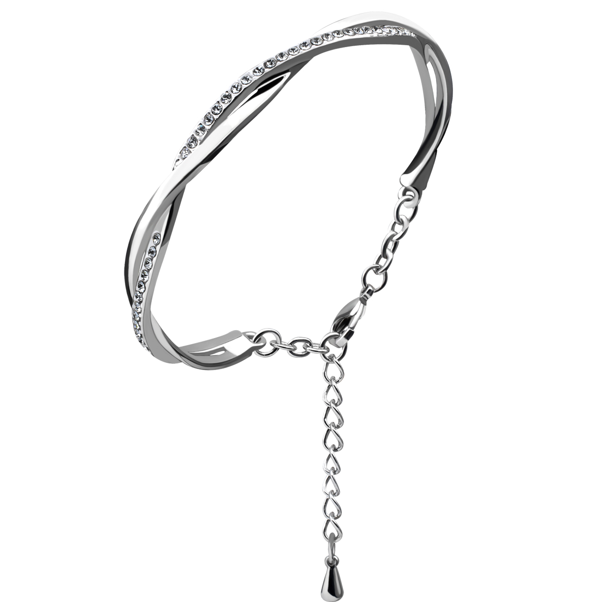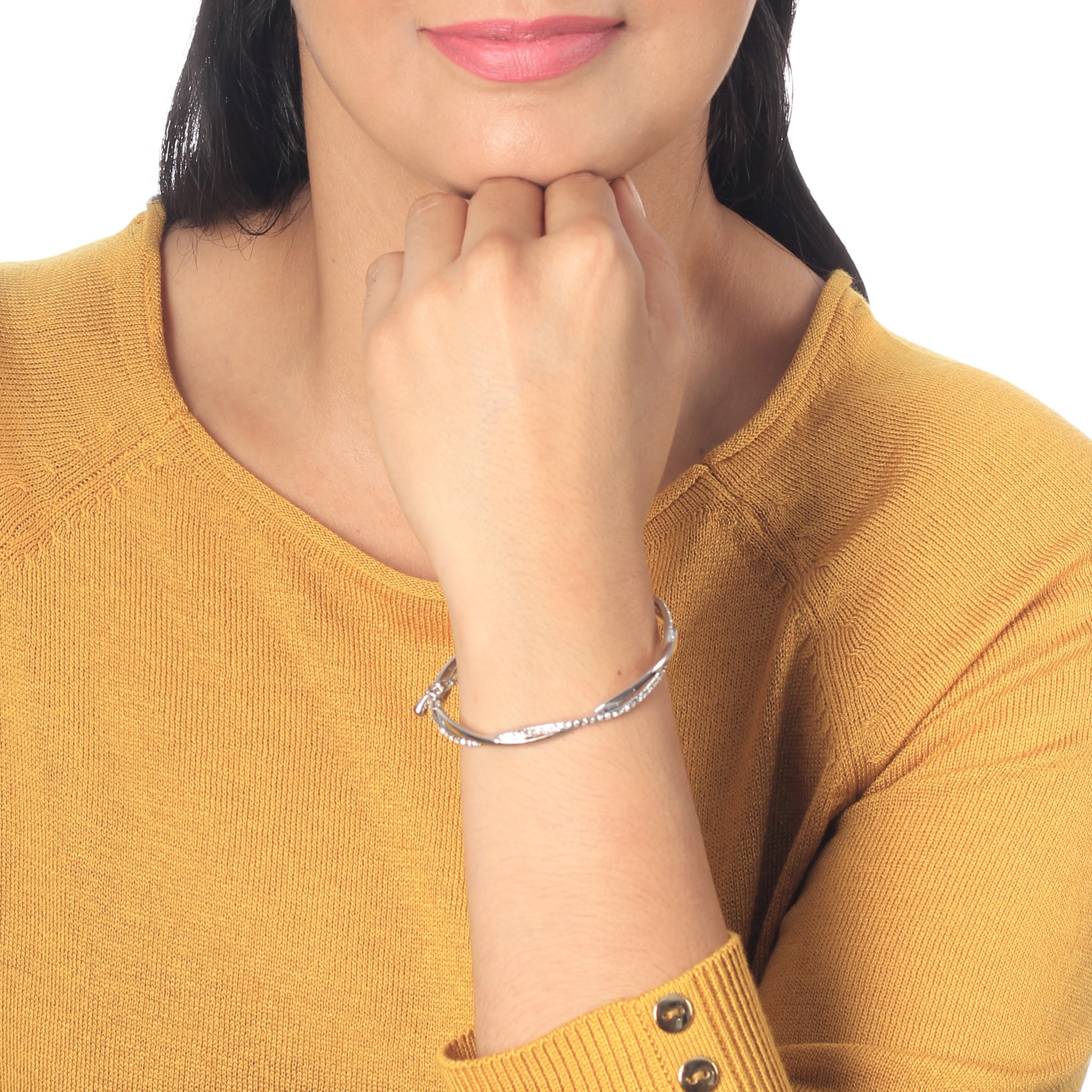 Hermoso brazalete en baño de oro blanco de 18 quilates, elegante diseño entrelazado con incrustraciones de cristales en color blanco. Fabricado en una estructura de aleación de platino con rodio sin níquel