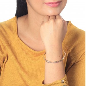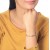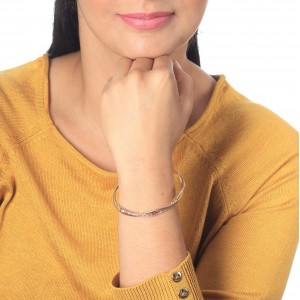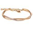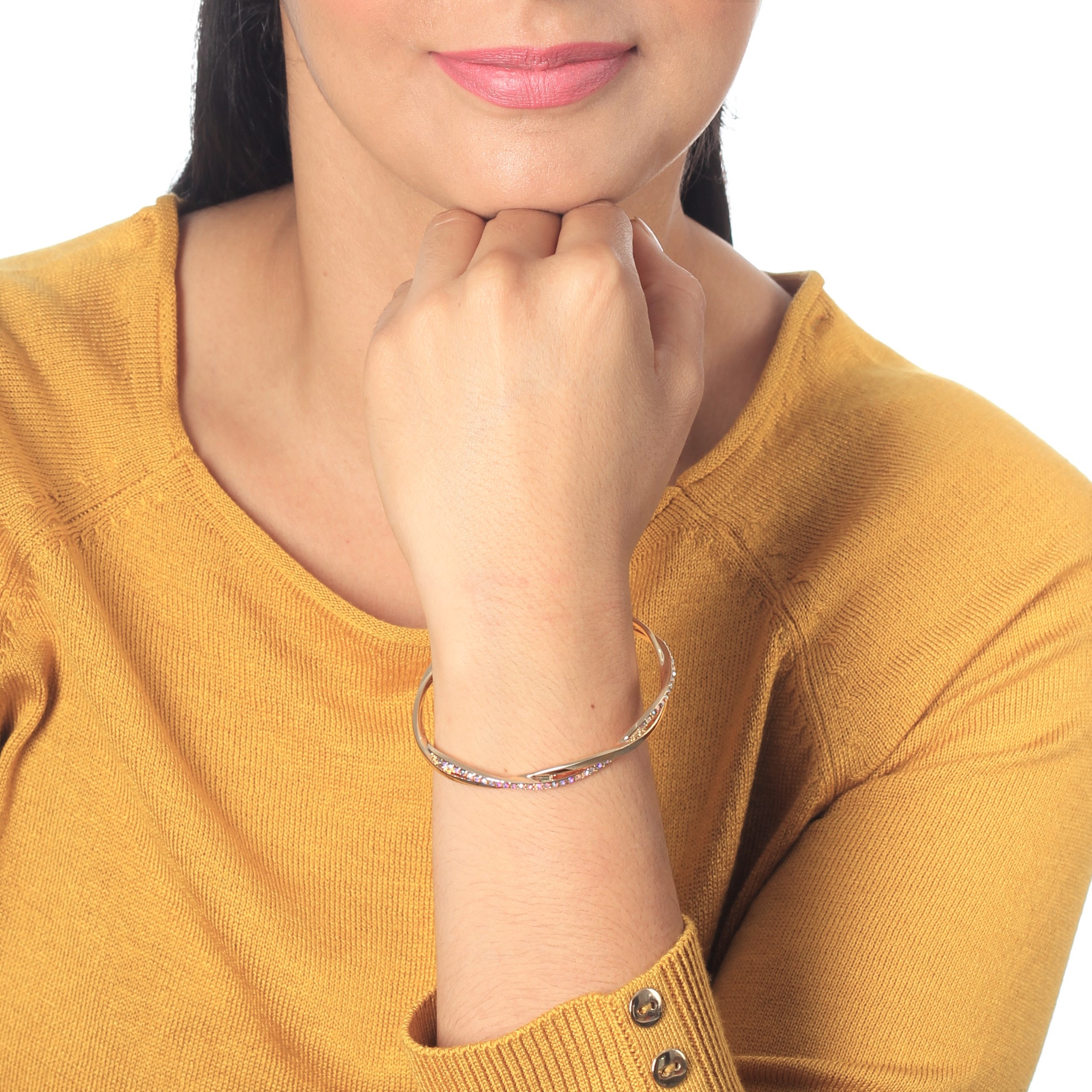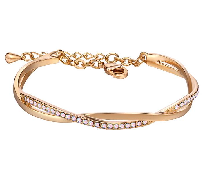 Hermoso brazalete en baño de oro amarillo de 18 quilates, elegante diseño entrelazado con incrustraciones de cristales en color tornasol. Fabricado en una estructura de aleación de platino con rodio sin níquel