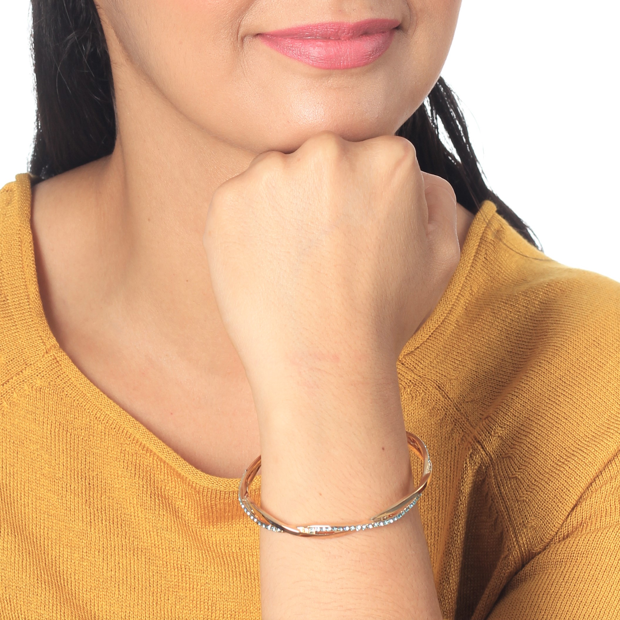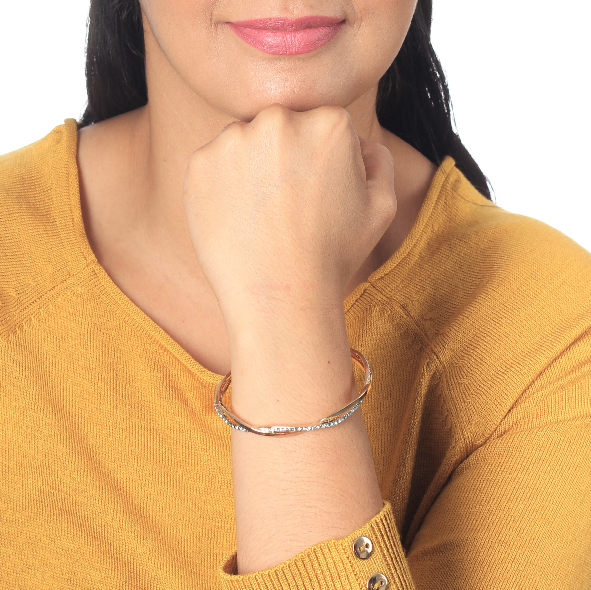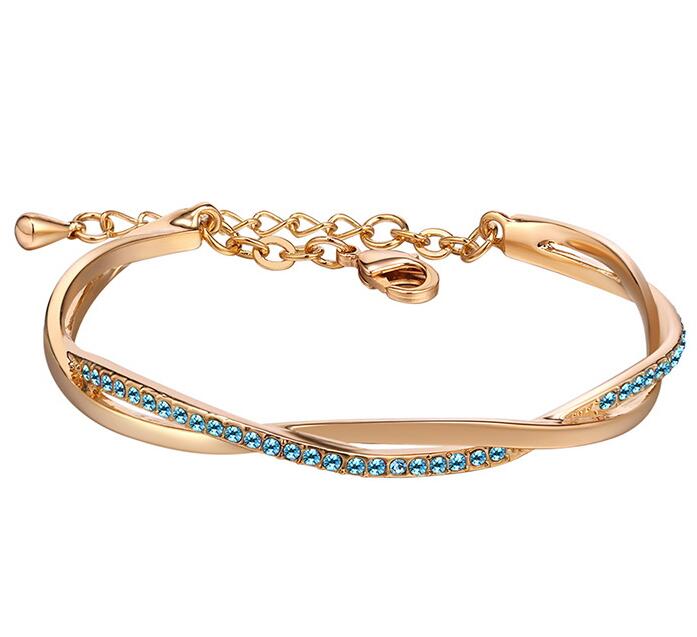 Hermoso brazalete en baño de oro amarillo de 18 quilates, elegante diseño entrelazado con incrustraciones de cristales en color azul. Fabricado en una estructura de aleación de platino con rodio sin níquel.