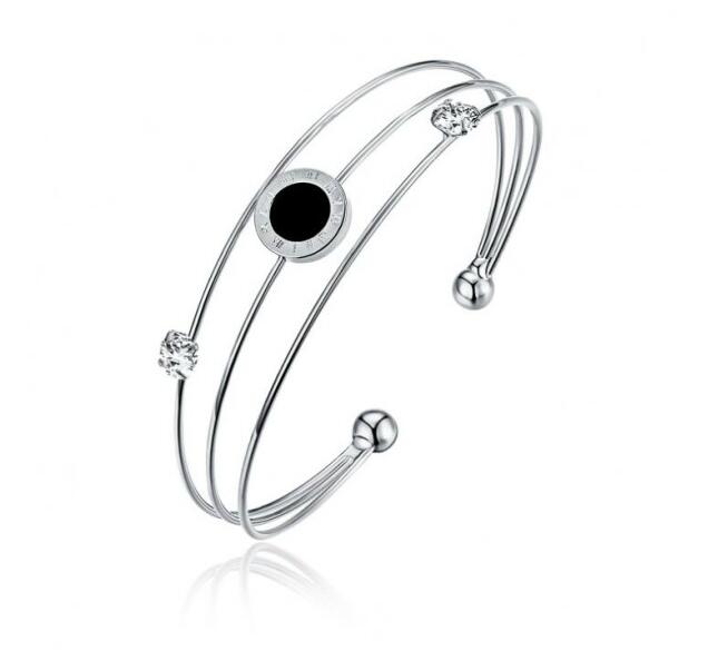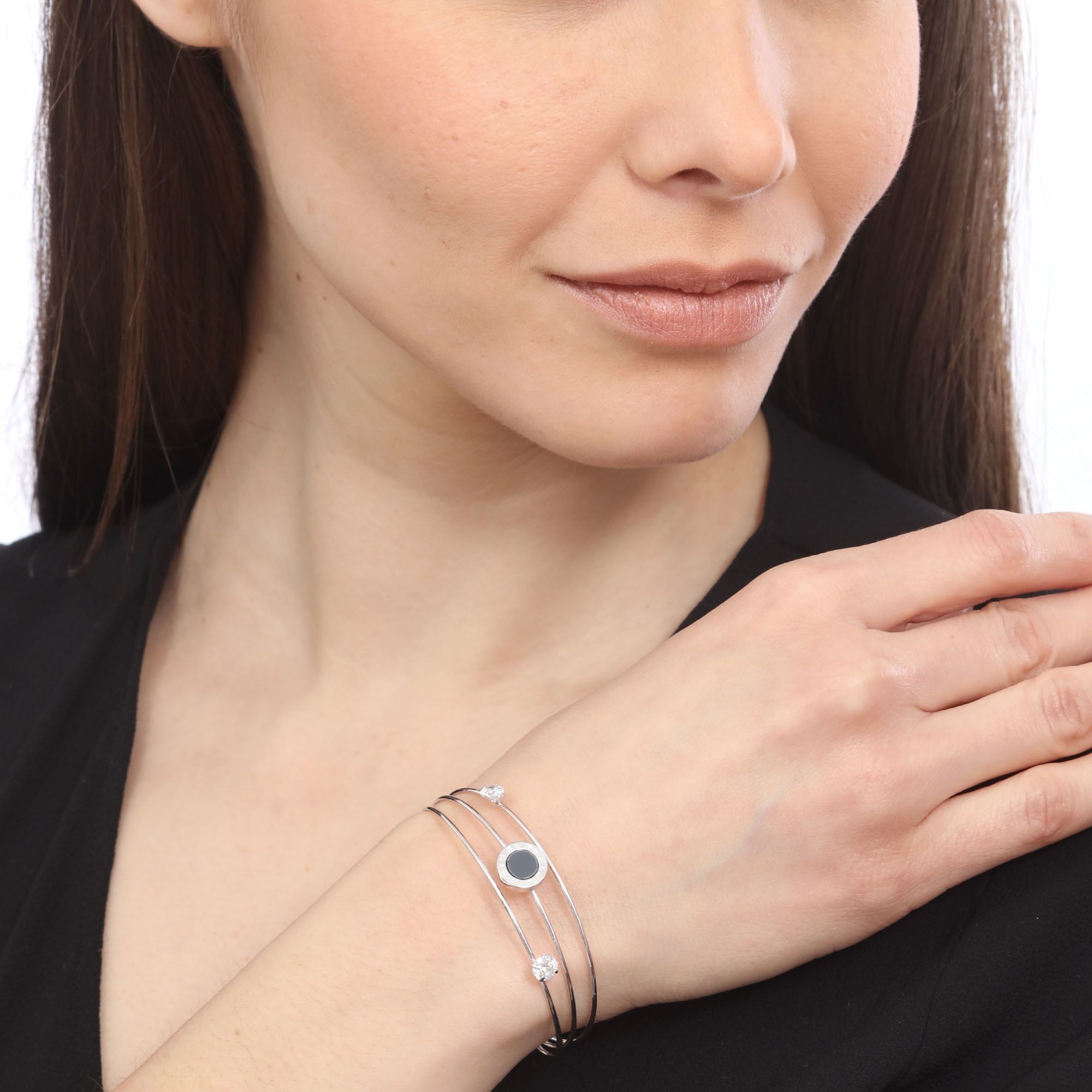 Pulsera en baño de oro blanco de 18 quilates, original diseño ajustable con incrustración de cristales en color blanco y detalle en esmaltado negro. Fabricado en una estructura de aleación de platino con rodio sin níquel