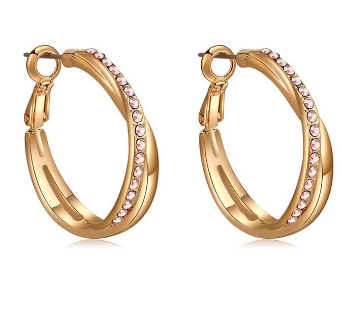 Hermosas arracadas en baño de oro amarillo de 18 quilates, diseño trenzado, con incrustaciones de cristales en color tornasol. Fabricado en una estructura de aleación de platino con rodio sin níquel.