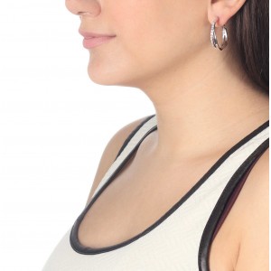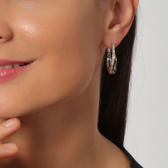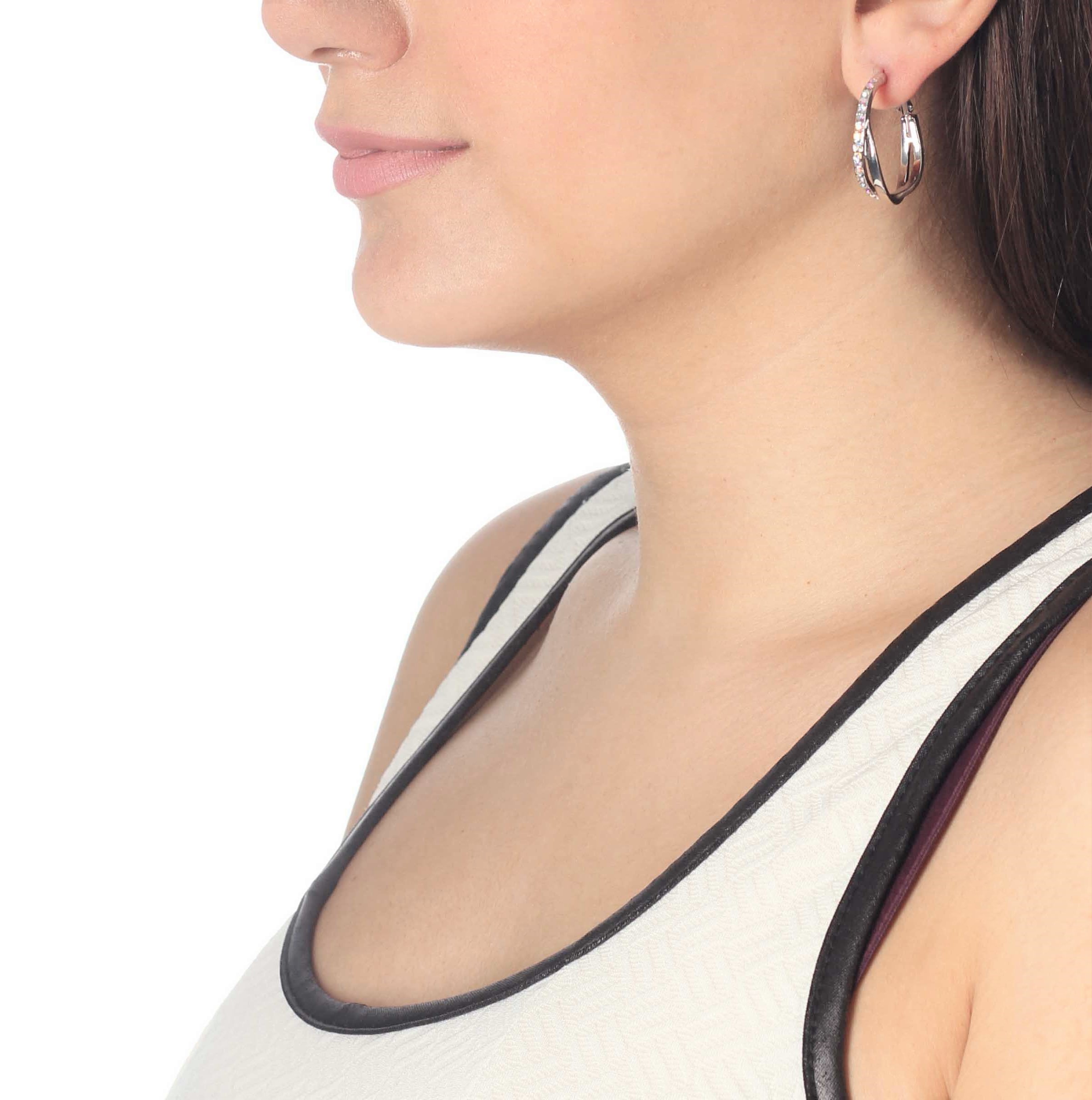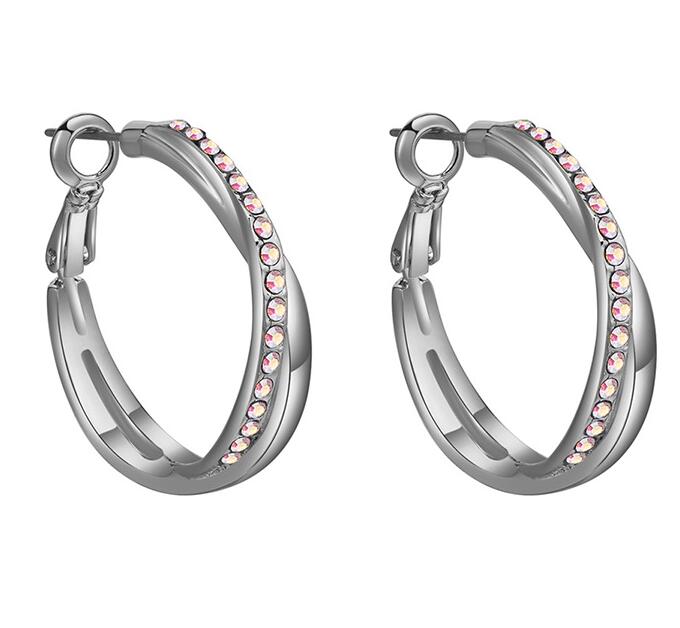 Hermosas arracadas en baño de oro blanco de 18 quilates, diseño con incrustaciones de cristales en color tornasol. Fabricado en una estructura de aleación de platino con rodio sin níquel.