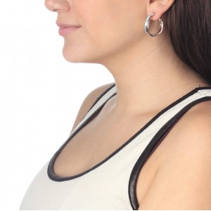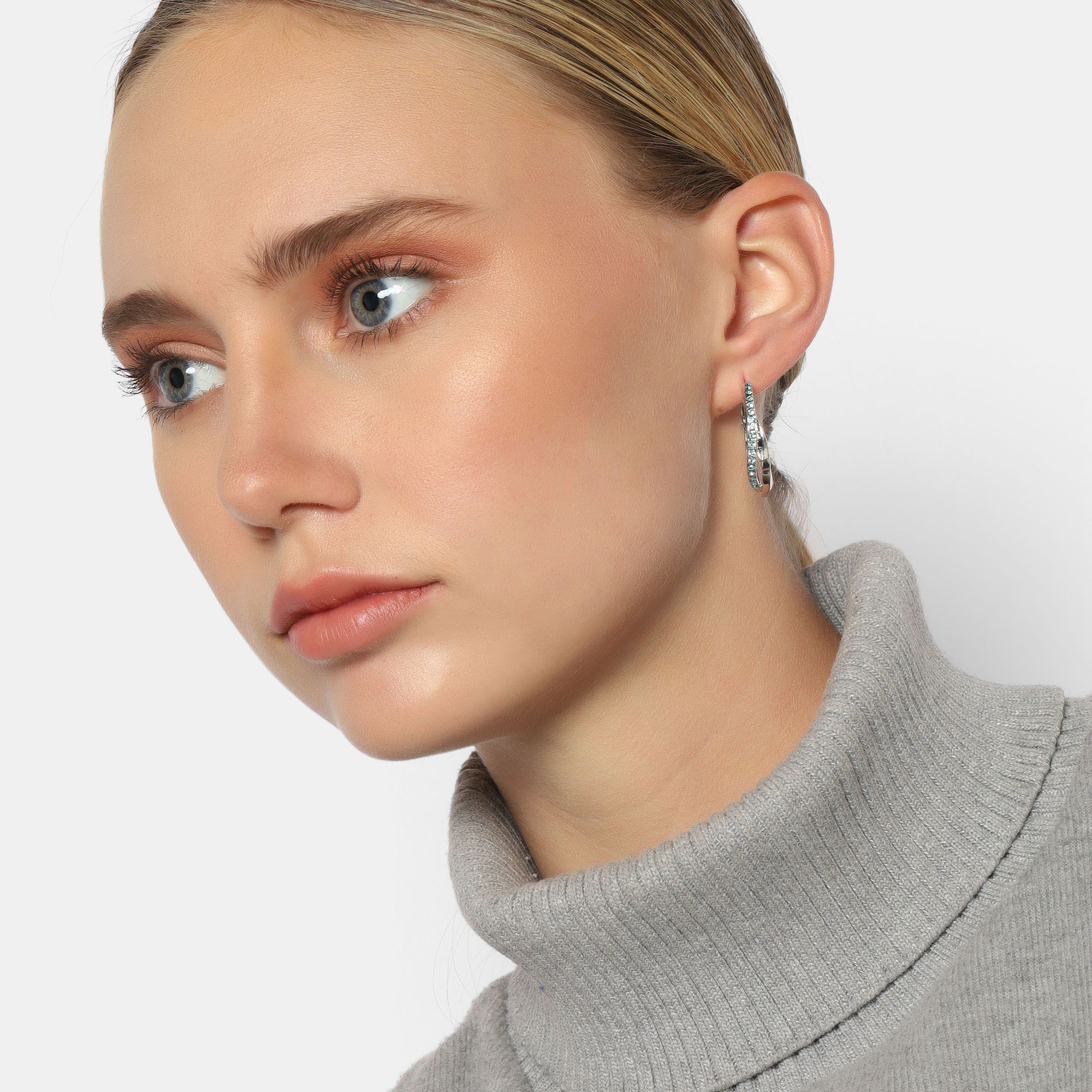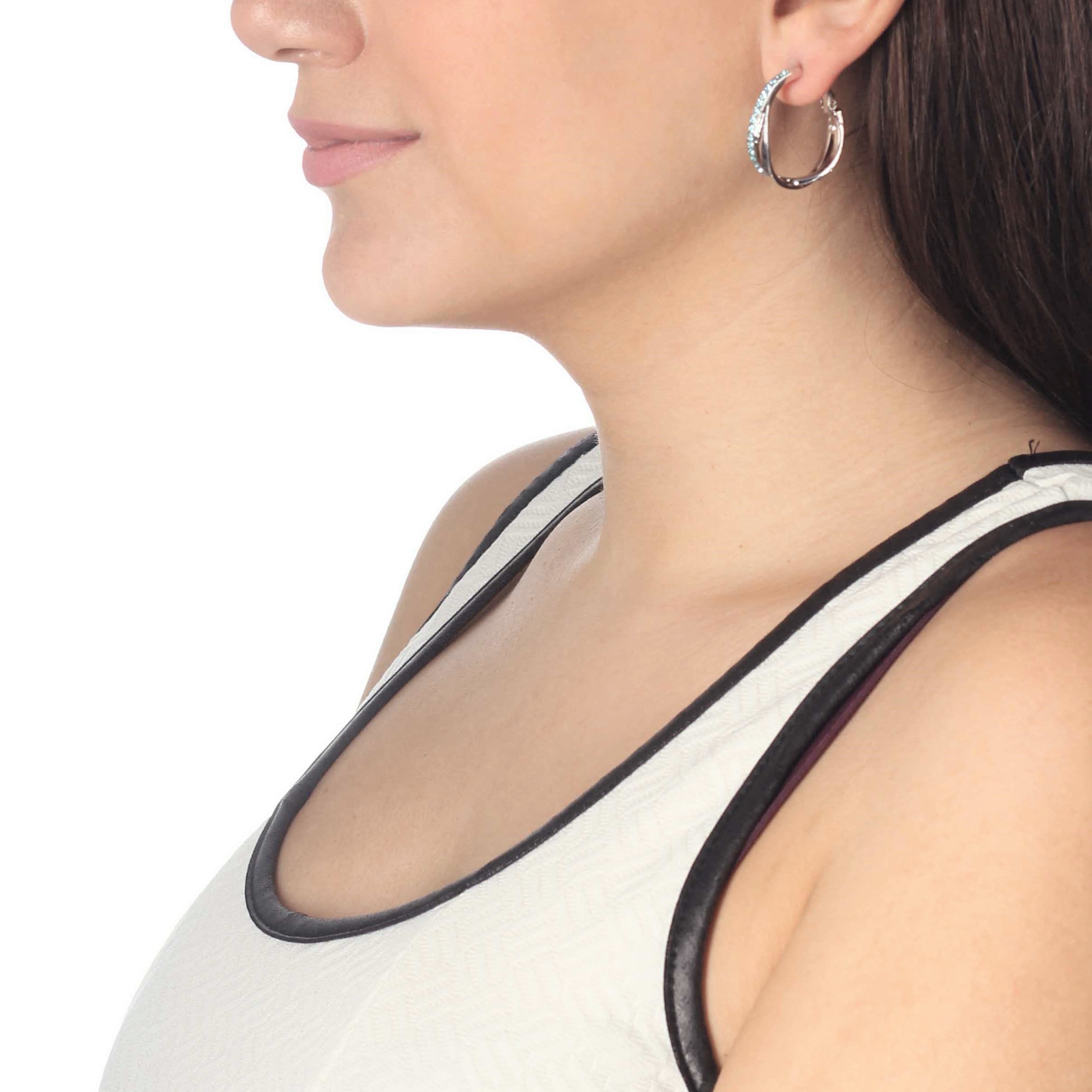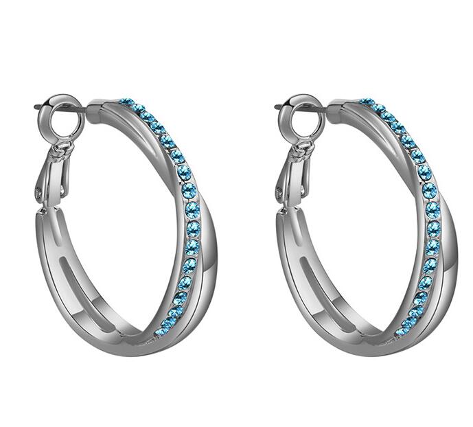 Hermosas arracadas en baño de oro blanco de 18 quilates, diseño con incrustaciones de cristales en color azul. Fabricado en una estructura de aleación de platino con rodio sin níquel.