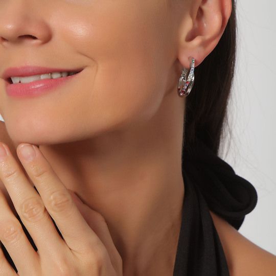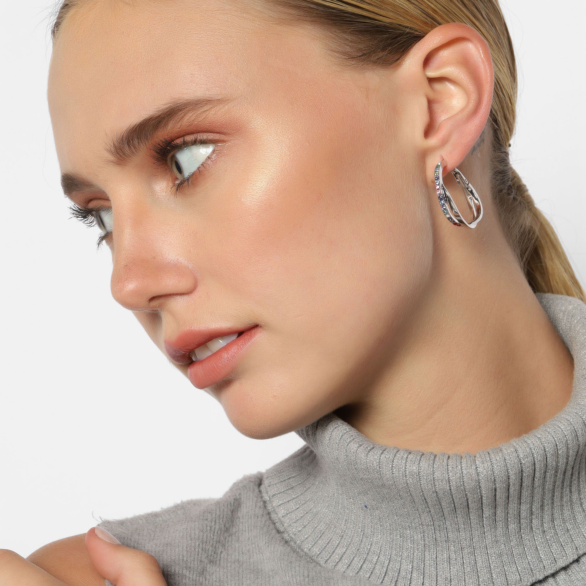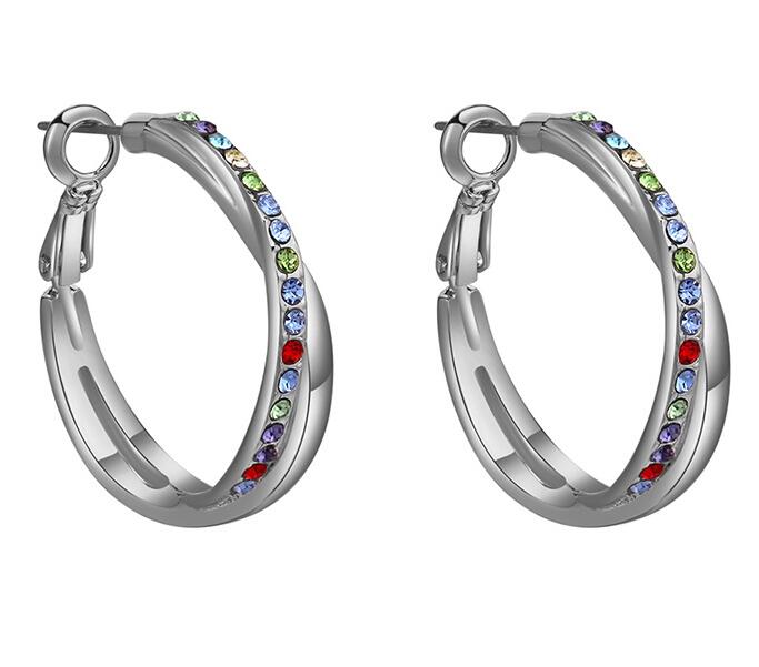 Hermosas arracadas en baño de oro blanco de 18 quilates, lindo diseño con incrustaciones de cristales en colores. Fabricado en una estructura de aleación de platino con rodio sin níquel.