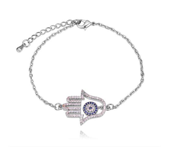 Pulsera en baño de oro blanco de 18 quilates, original diseño de mano de "Hamsa" con incrustraciones de cristales en color azul y blanco. Fabricado en una estructura de aleación de platino con rodio sin níquel.