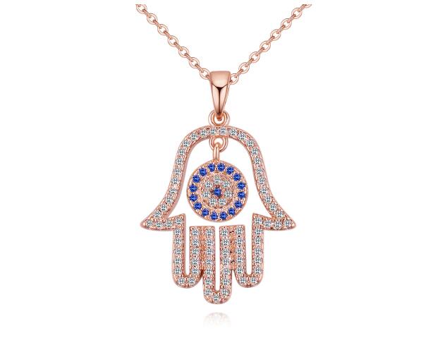 Dije con cadena en baño de oro rosa de 18 quilates, original diseño de mano de "Hamsa" con incrustraciones de cristales en color azul y blanco. Fabricado en una estructura de aleación de platino con rodio sin níquel.