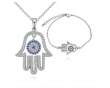 Hermoso juego de pulsera y dije con cadena en baño de oro blanco de 18 quilates, diseño de "Hamsa" con incrustaciones de cristales en color azul y blanco.