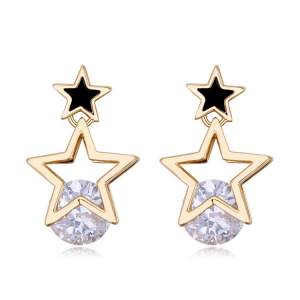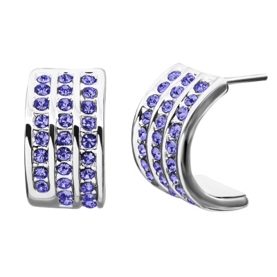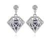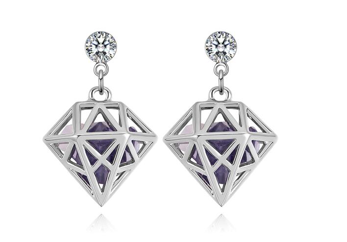 Aretes en baño de oro blanco de 18 quilates, original diseño de pentágono con incrustaciones de cristales en color morado y blanco. Fabricado en una estructura de aleación de platino con rodio sin níquel.